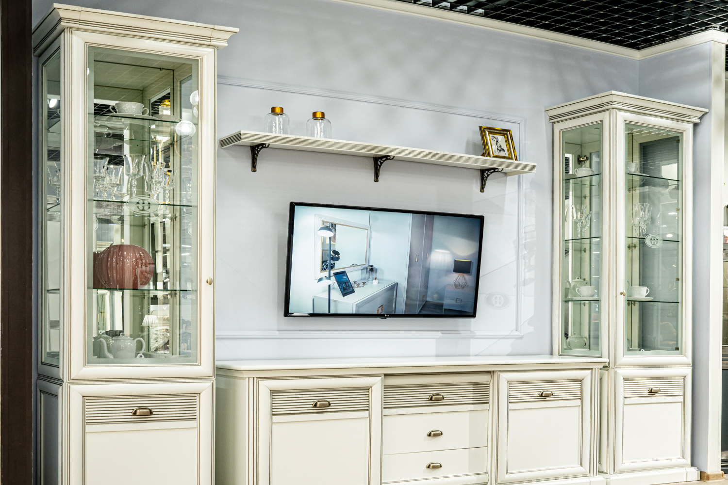 Лакированное покрытие в сочетании с патиной придает мебельному набору идеальную гладкость и блеск, защищает о воздействия солнечного ультрафиолета. Гостиная выполнена из долговечной, экологичной древесной плиты. Качественная фурнитура, изготовленная в оттенке «античное серебро», обеспечивает бесшумное, плавное движение всех элементов. Застекленные фасады, внутренние зеркальные стенки, чистый белый цвет преображают, визуально увеличивают комнатное пространство.