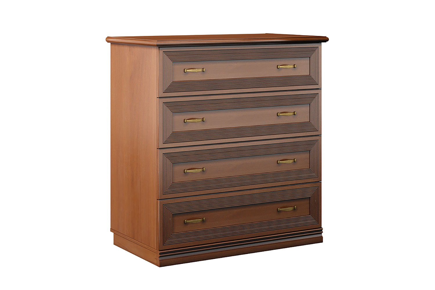Изящный комод отличается чистотой линий и простотой исполнения. Главные декоративные элементы — фрезерованные филенки и невысокий цоколь. За счет лаконичного вида, легкости форм изделие прекрасно впишется в любой классический и неоклассический интерьер.
