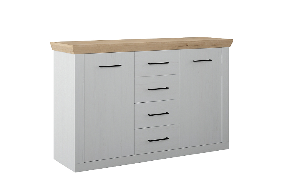 Эффектный напольный комод в базовом цвете станет отличным решением при выборе системы хранения для спальни или гостиной в стиле кантри, прованс или облегченный лофт. Корпус мебели в оттенке «блан-шене» гармонично сочетается со столешницей, текстурированной под древесину «дуб бунратти». Края крышки изделия несколько выступают за пределы каркаса и оформлены в скошенном варианте. Гладкую поверхность фасадов подчеркивает минималистичная металлическая фурнитура, выполненная под «античное железо черное».