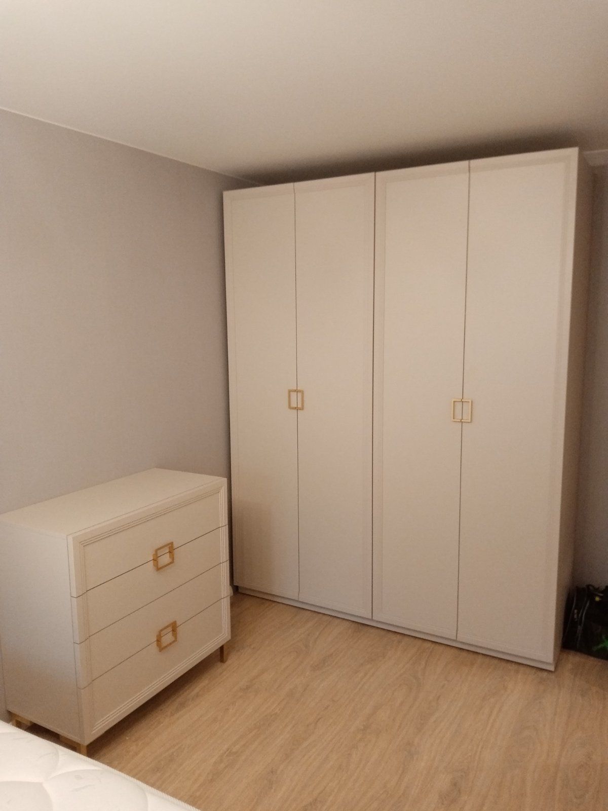 Роскошь серого кашемира в сочетании с фурнитурой под золото выглядит солидно и эффектно. Совмещенные вместе ручки образуют прямоугольник, дублирующий общую геометрию мебели. Фасад рамочной конструкции обрамлен двойными филенками. Опоры изделия скрыты элегантным декоративным цоколем, окрашенным в основной тон. Такая модель станет отличным вариантом для оформления спальни, гостиной, прихожей или детской в стиле ар-деко, классика, модерн.