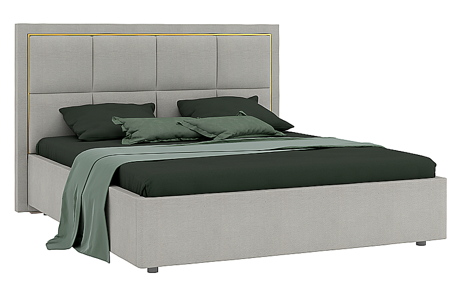 Обивка стильного оттенка «серый кашемир» выполнена из практичного и износостойкого микровелюра. Высокое изголовье простегано декоративной строчкой, украшено по периметру золотой окантовкой. Каркас изделия изготовлен из ламинированной ДСП. Мягкая отделка сводит риск травматизации в ночной атмосфере спальни к минимуму. Упругие ламели ложа обладают ортопедическим эффектом. Металлические ножки-опоры окрашены порошковой краской в серый цвет.