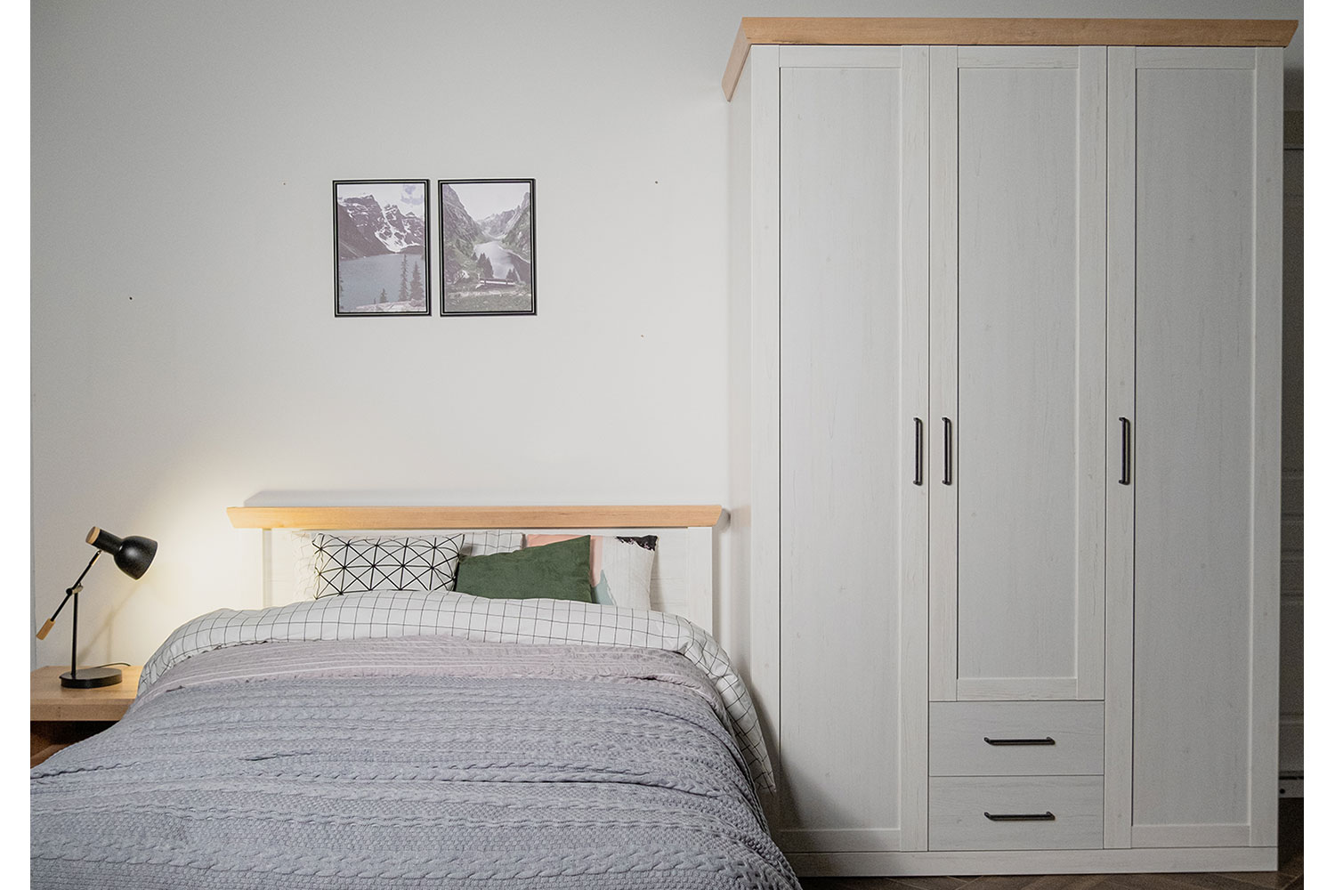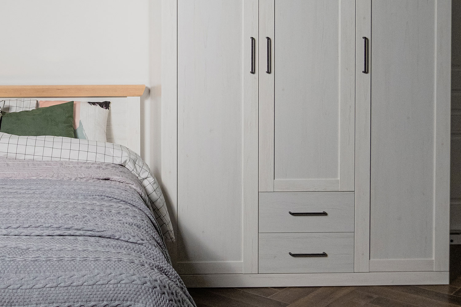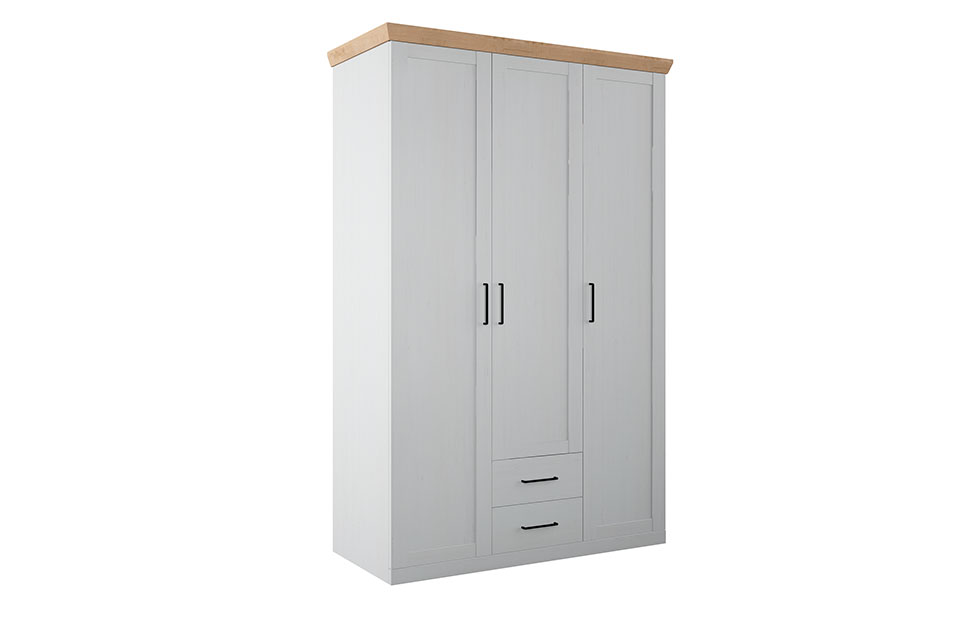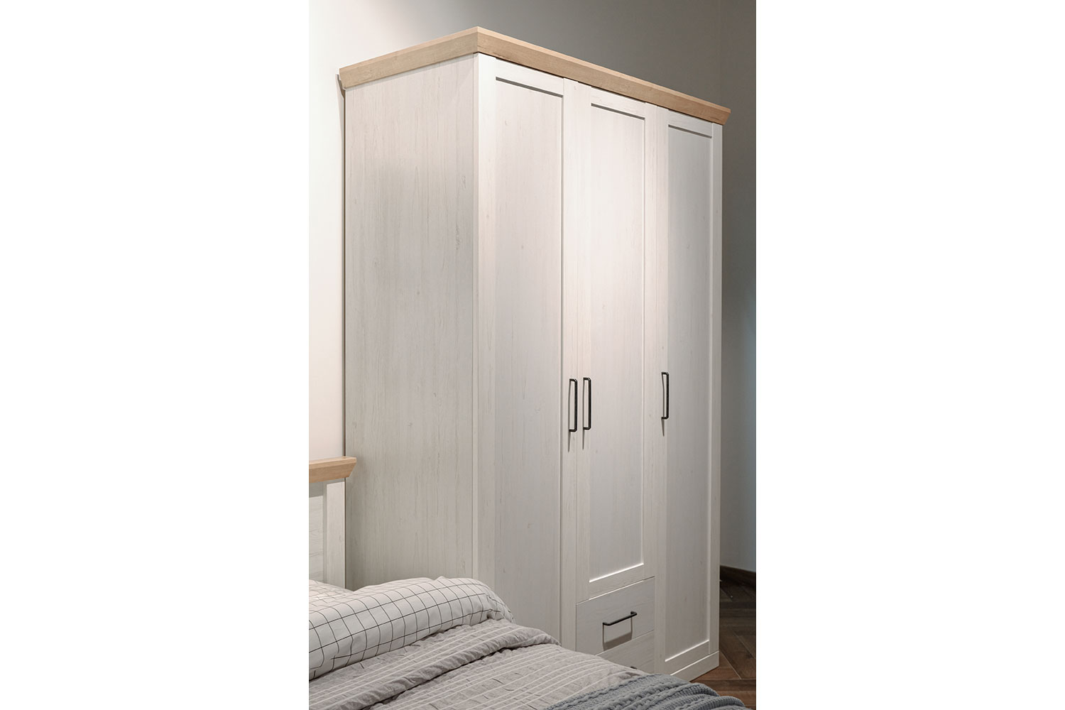 Удобный трехстворчатый платяной шкаф поможет разместить все необходимое, начиная от текстиля и аксессуаров и заканчивая одеждой на вешалках. Практичный оттенок блан-шене, разбавленный теплым древесным цветом дуб бунратти, идеально впишется в любое светлое помещение в стиле сканди, фьюжн, классика или минимализм.