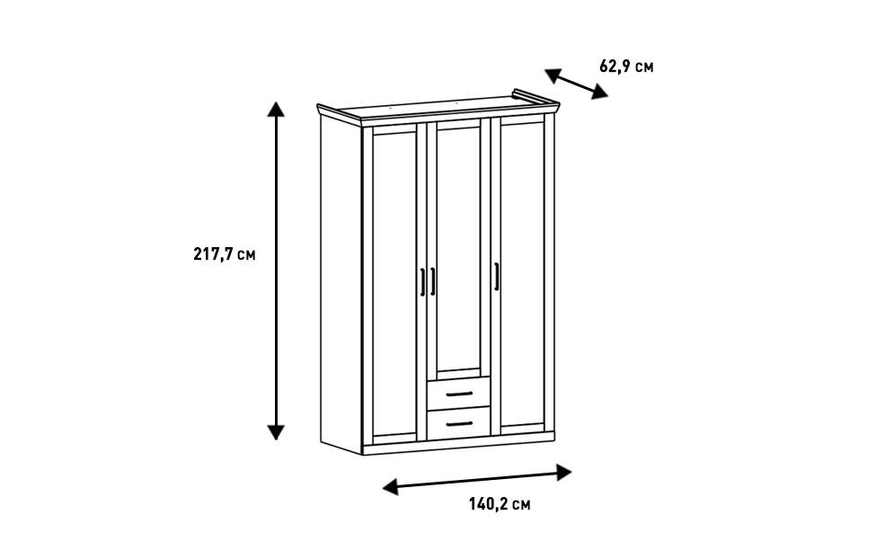 Конструкция состоит из трех отделений: центральный отсек занят полками и двумя ящиками, два боковых включают в себя верхнюю полочку и секцию со встроенной штангой. По запросу покупателя комплектация может быть изменена. Лаконичный цоколь скрывает регулируемые опоры, верхнюю часть модели украшает стильный карниз. Распашные фасады и выдвижные модули декорированы контрастными черными ручками-скобами, для средней двери возможен право- и левосторонний вариант навешивания. Петли с доводчиками и скрытые направляющие с демпферами гарантируют приятную эксплуатацию мебели.