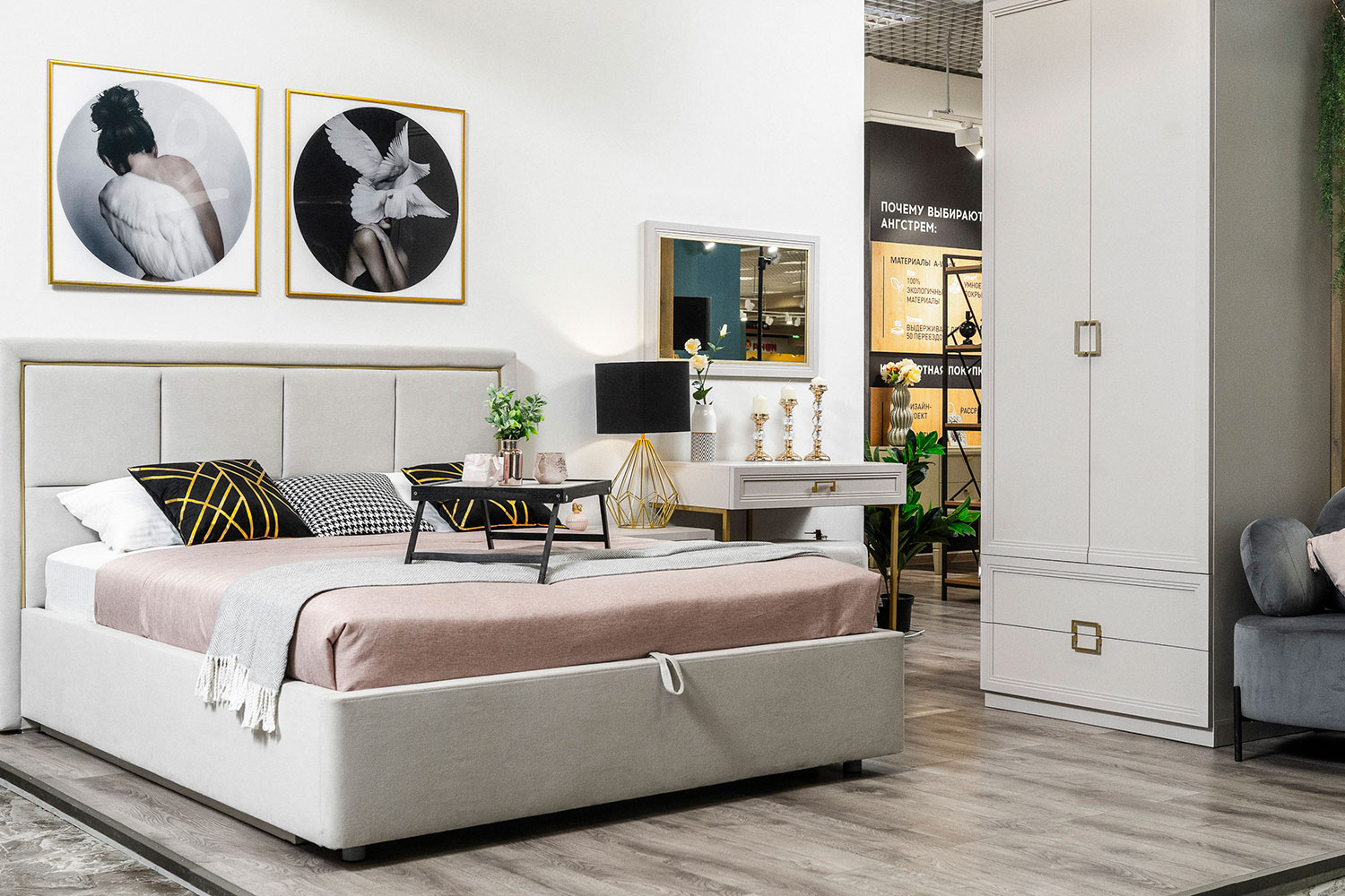 - Декоративная акцентная рама в изголовье кровати повторяет форму ручек.