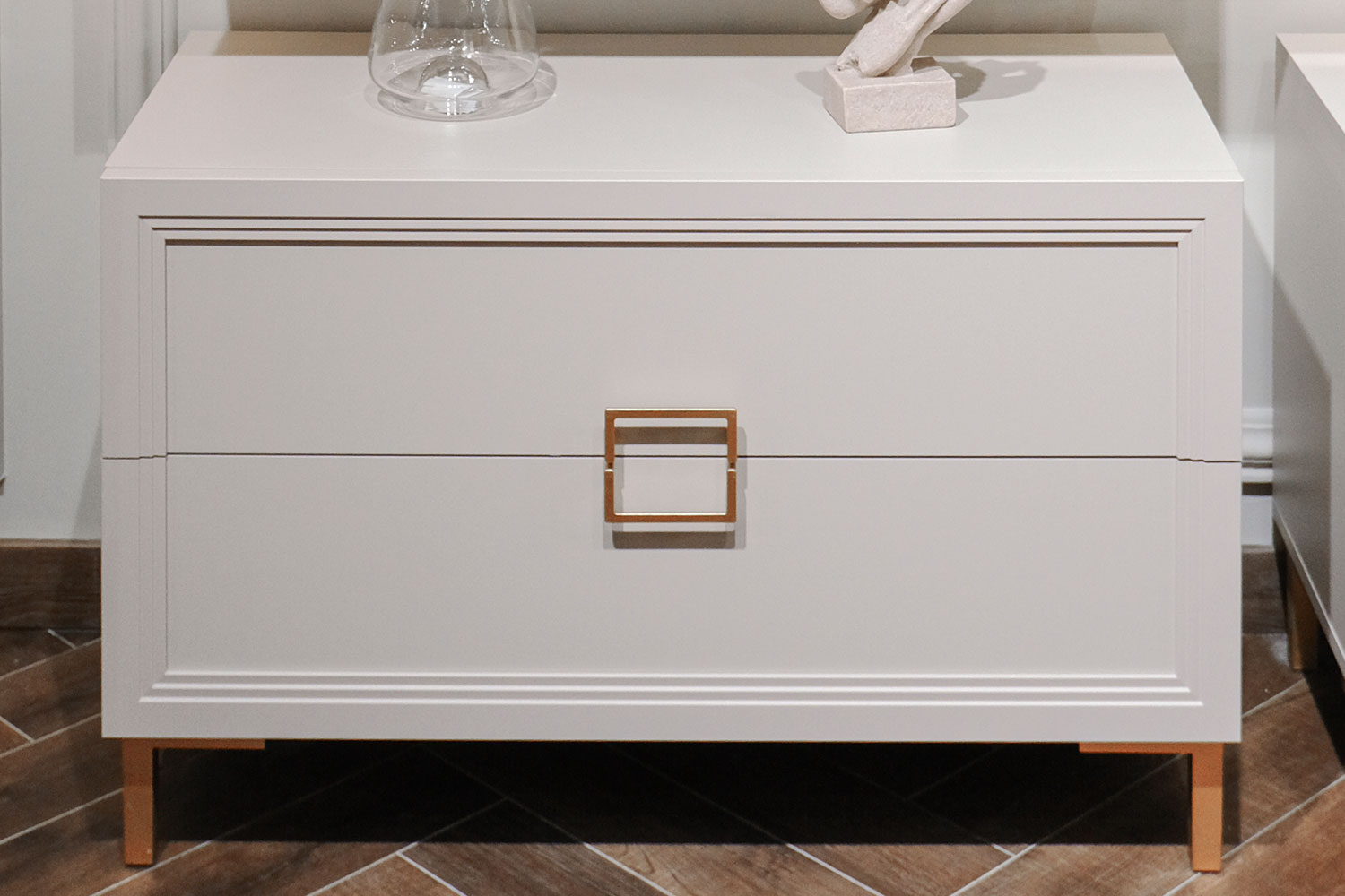 - Основу дизайна составляет геометрический символ — квадрат. Это видно по золотым матовым ручкам на тумбах и шкафах;