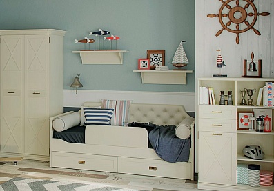 - Шкафы, комод и кровать украшены изящными фахверками. Эти декоративные элементы отсылают к Старой Европе и создают дополнительные неброские акценты в интерьере;