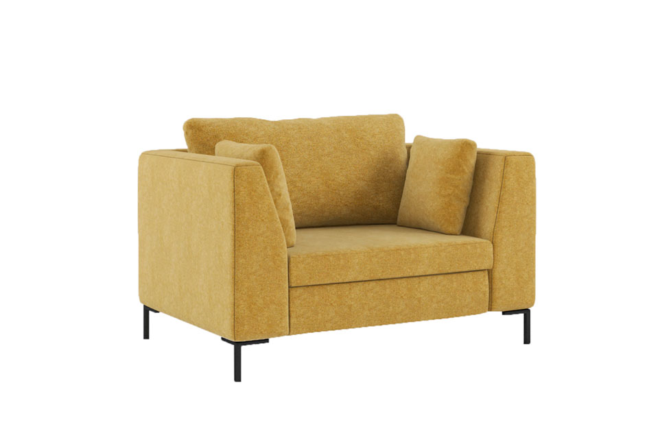 Яркая модель по форме больше напоминает компактный диван. Широкие скошенные кверху подлокотники, глубокое сиденье, входящие в комплект одна большая и две маленькие декоративные подушки делают посадочное место идеальным для отдыха и релакса. Черные прямоугольные тонкие опоры подчеркивают общую геометрию изделия и сложный цвет обивки. Кресло можно установить в гостиной или просторной прихожей в стиле модерн, ар-деко, контемпорари. Для изготовления «Челси» используются калиброванный хвойный брус разной толщины, первосортная фанера, ДСП и ДВП. Основание — деревянная рама, наполнение сиденья — несколько слоев мягких и эластичных экологичных материалов — синтепона, термовойлока, пенополиуретана высокой эластичности и повышенной жесткости, а также memory foam — пены, мгновенно восстанавливающей изначальную форму. Отделка из микровелюра отличается прочностью и устойчивостью к многочисленным чисткам и истиранию.
