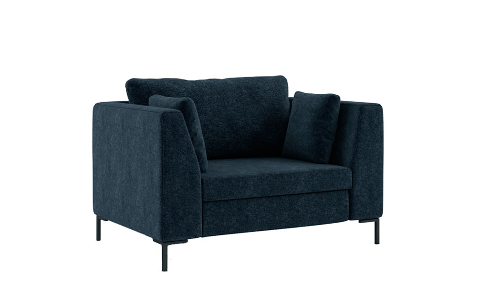 Стильные прямоугольные формы, лаконичный дизайн, высокие металлические ножки с черным порошковым покрытием отлично впишутся в современный минималистичный интерьер, обстановку в стиле лофт или модерн. Изделие выглядит массивно и солидно, тонкие опоры придают креслу респектабельность и элегантность. Низкая спинка гармонично сочетается с высокими скошенными подлокотниками. В комплект входит три декоративных подушки — одна приспинная и две боковых, с их помощью пользователь сможет устроиться с максимальным комфортом.