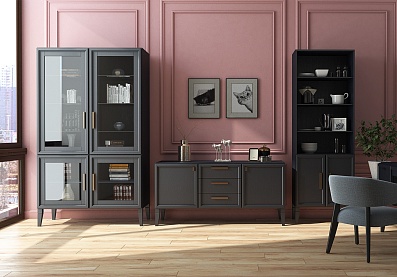 - Комод с тремя секциями: средняя секция — с двумя полками, за распашными фасадами — по одной съемной щитовой полке;