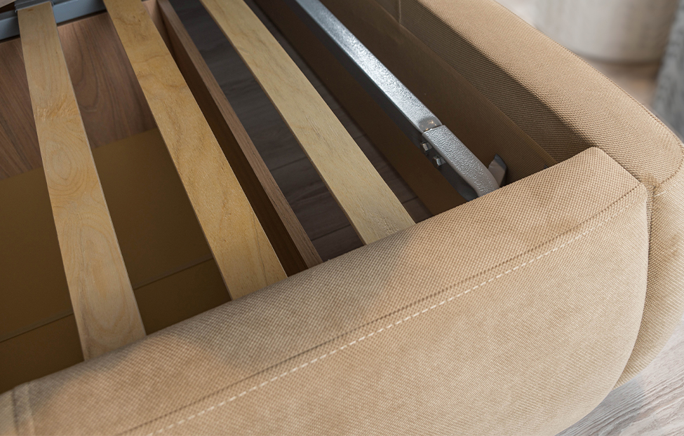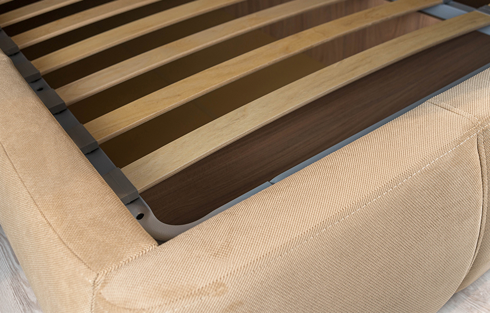 - Спальное место: ортопедическая решетка из металлического каркаса и гнуто-клееных лат;
