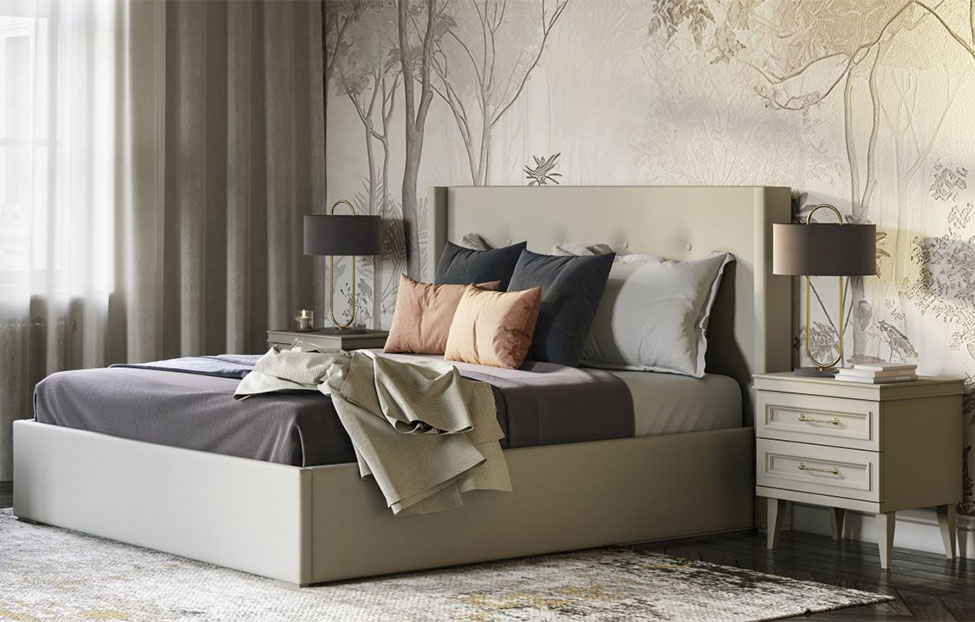 - двуспальная кровать с мягким изголовьем, отделанным микровелюром с элементами утяжки и пуговицами;