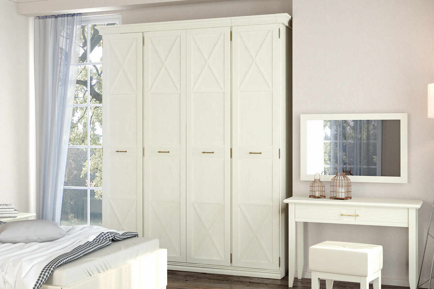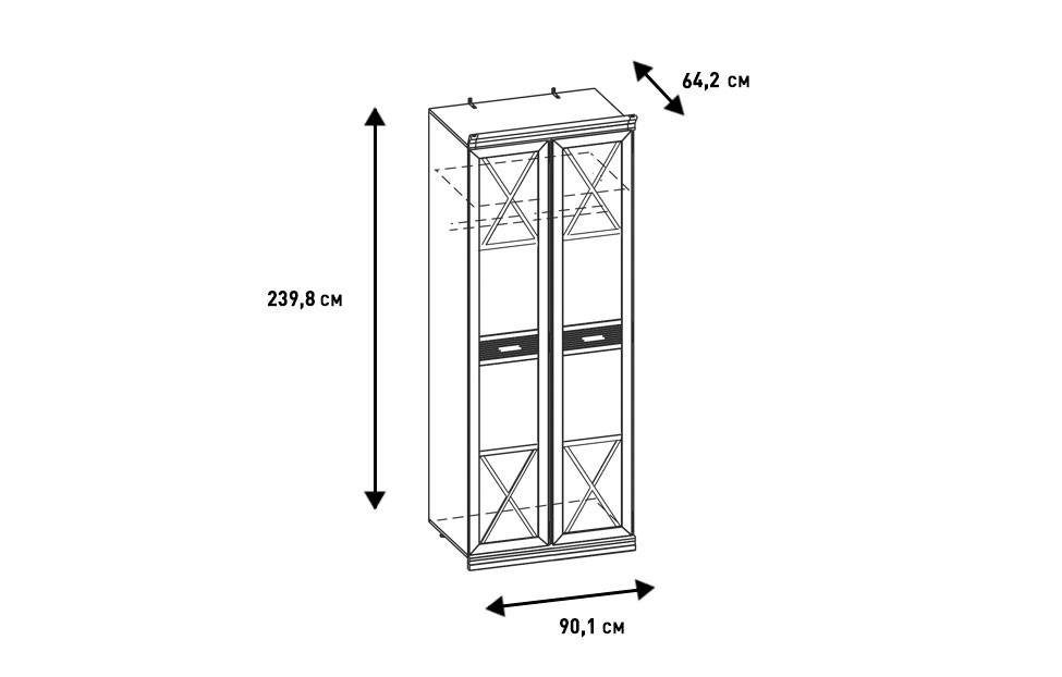 Изделие представляет собой современное прочтение классического дизайна. Шкаф имеет традиционную рамочную конструкцию, глухие фасады декорированы стильными элементами фахверками. Композицию органично дополняют вставки со сложной фрезеровкой и элегантная фурнитура в виде ручек-скоб в оттенке «античная бронза». Металлические опоры позволяют регулировать высоту мебели соответственно неровностям напольного покрытия. Цоколь из МДФ-профиля изящно скрывает прочные ножки.