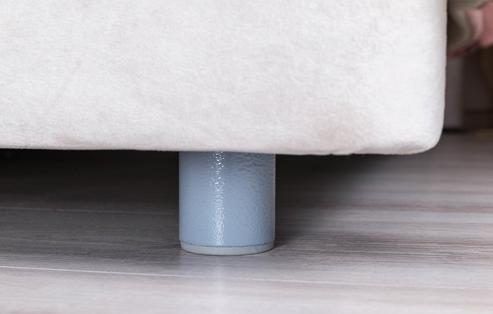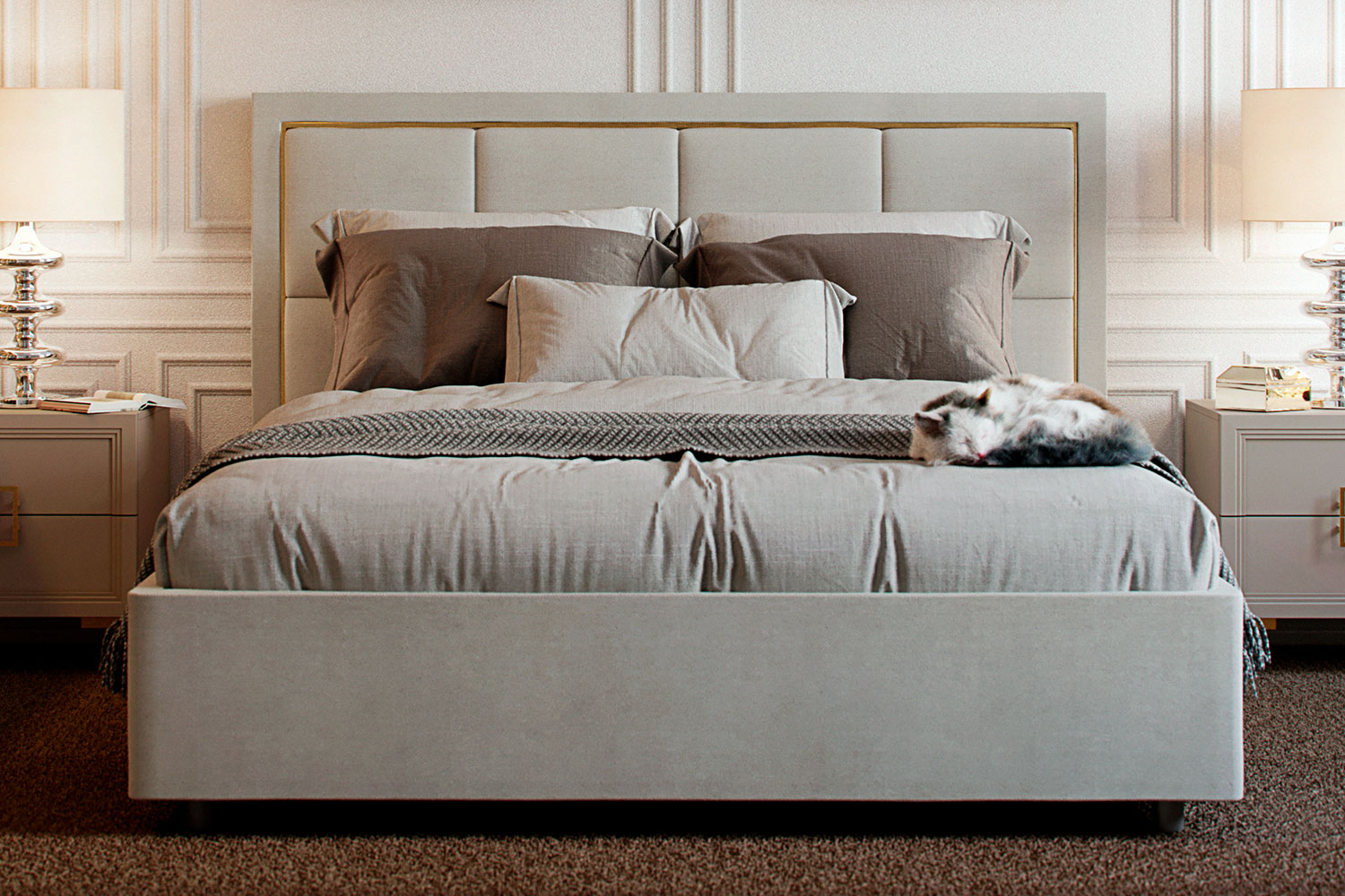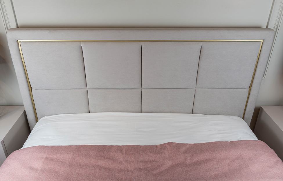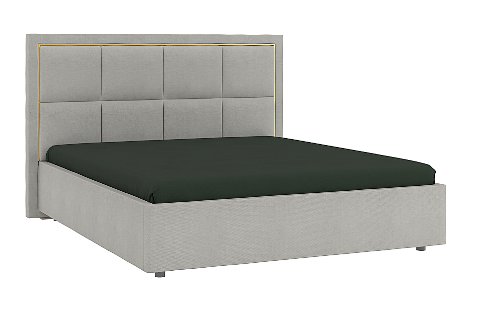 Обивка стильного оттенка «серый кашемир» выполнена из практичного и износостойкого микровелюра. Высокое изголовье простегано декоративной строчкой, украшено по периметру золотой окантовкой. Каркас изделия изготовлен из ламинированной ДСП. Мягкая отделка сводит риск травматизации в ночной атмосфере спальни к минимуму. Упругие ламели ложа обладают ортопедическим эффектом. Металлические ножки-опоры окрашены порошковой краской в серый цвет.