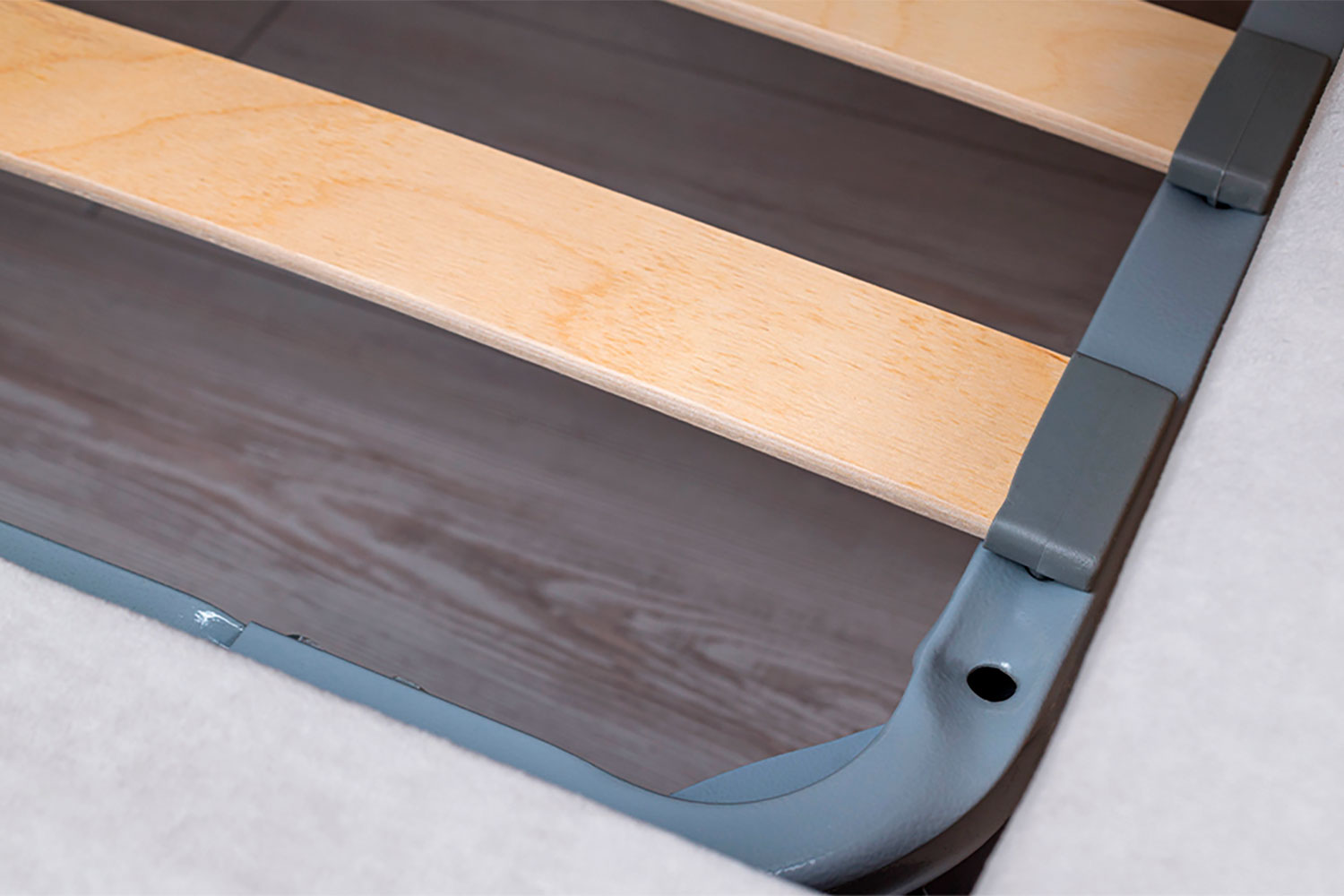 Обивка стильного оттенка «серый кашемир» выполнена из практичного и износостойкого микровелюра. Высокое изголовье простегано декоративной строчкой, украшено по периметру золотой окантовкой. Каркас изделия изготовлен из ламинированной ДСП. Мягкая отделка сводит риск травматизации в ночной атмосфере спальни к минимуму. Упругие ламели ложа обладают ортопедическим эффектом. Металлические ножки-опоры окрашены порошковой краской в серый цвет.