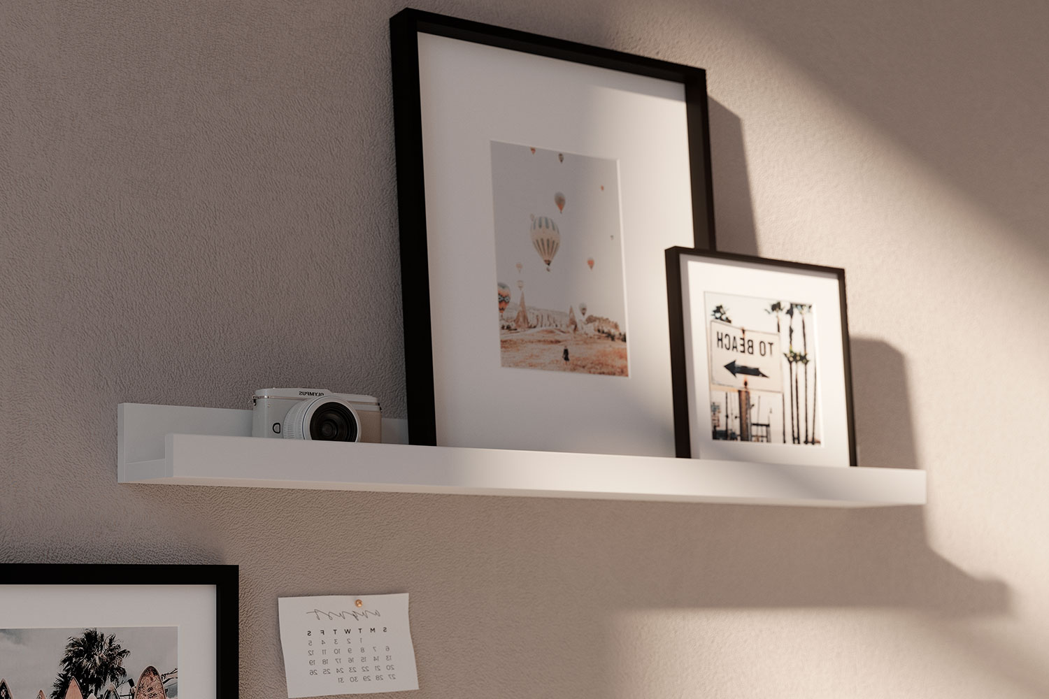 Полку можно использовать в композиции — комбинировать несколько вариантов размеров, чтобы создать настоящую галерею семейных фотографий или картин. Передний ограничительный профиль не даст соскользнуть предметам с полки.