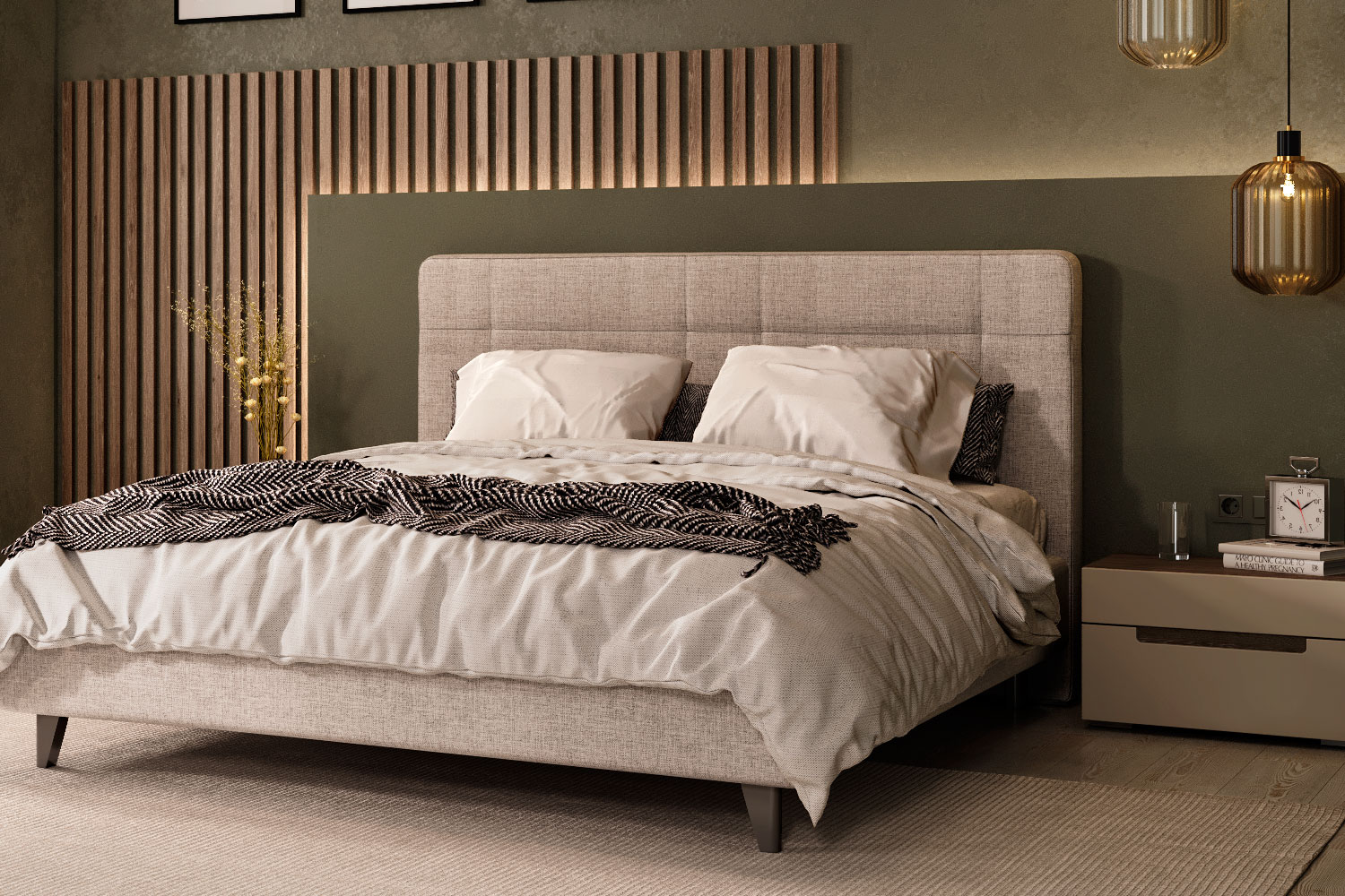 - Спальня в современном минималистичном стиле. Такая мебель универсальна и подойдет интерьерам в стилях эко, скандинавский, минимализм и лофт (в его более «легком» варианте);