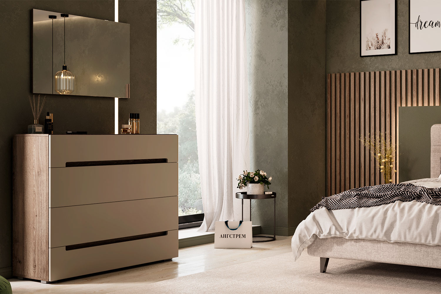 - Композиция Анри понравится тем, кто ценит лаконичность в интерьере. Спокойные четкие линии и формы, природные цвета создают ощущение комфорта и свободы.