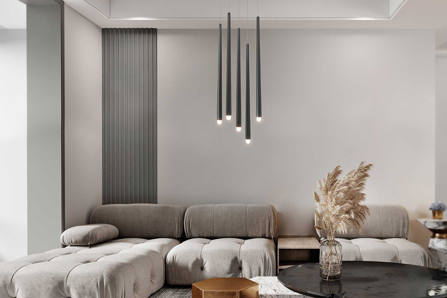 Светильник визуально вытягивает помещение и задает ритм движению в пространстве. Подойдет для потолков разной высоты, благодаря регулируемым проводам.