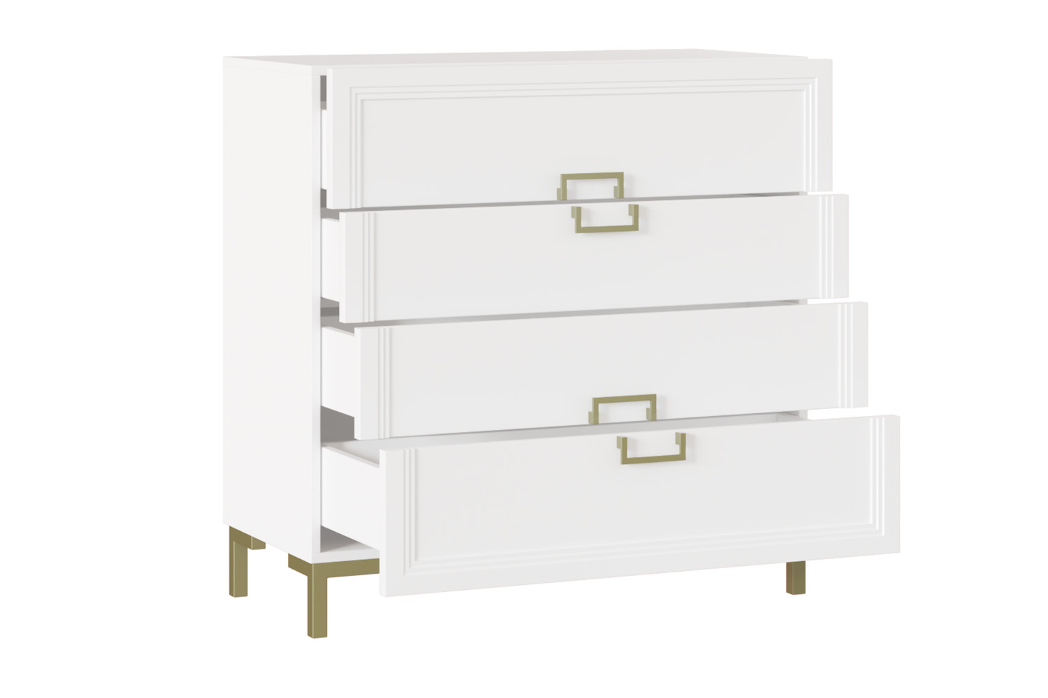 Элегантный лаконичный комод с четкими прямыми линиями будет превосходно смотреться в спальне, гостиной, прихожей, оформленной в стиле ар-деко или минимализм. Четыре выдвижных ящика визуально объединены рисунком квадратных ручек. Изящный оттенок «белый премиум», фурнитура и опоры «под золото» только усиливают эффектность мебели.