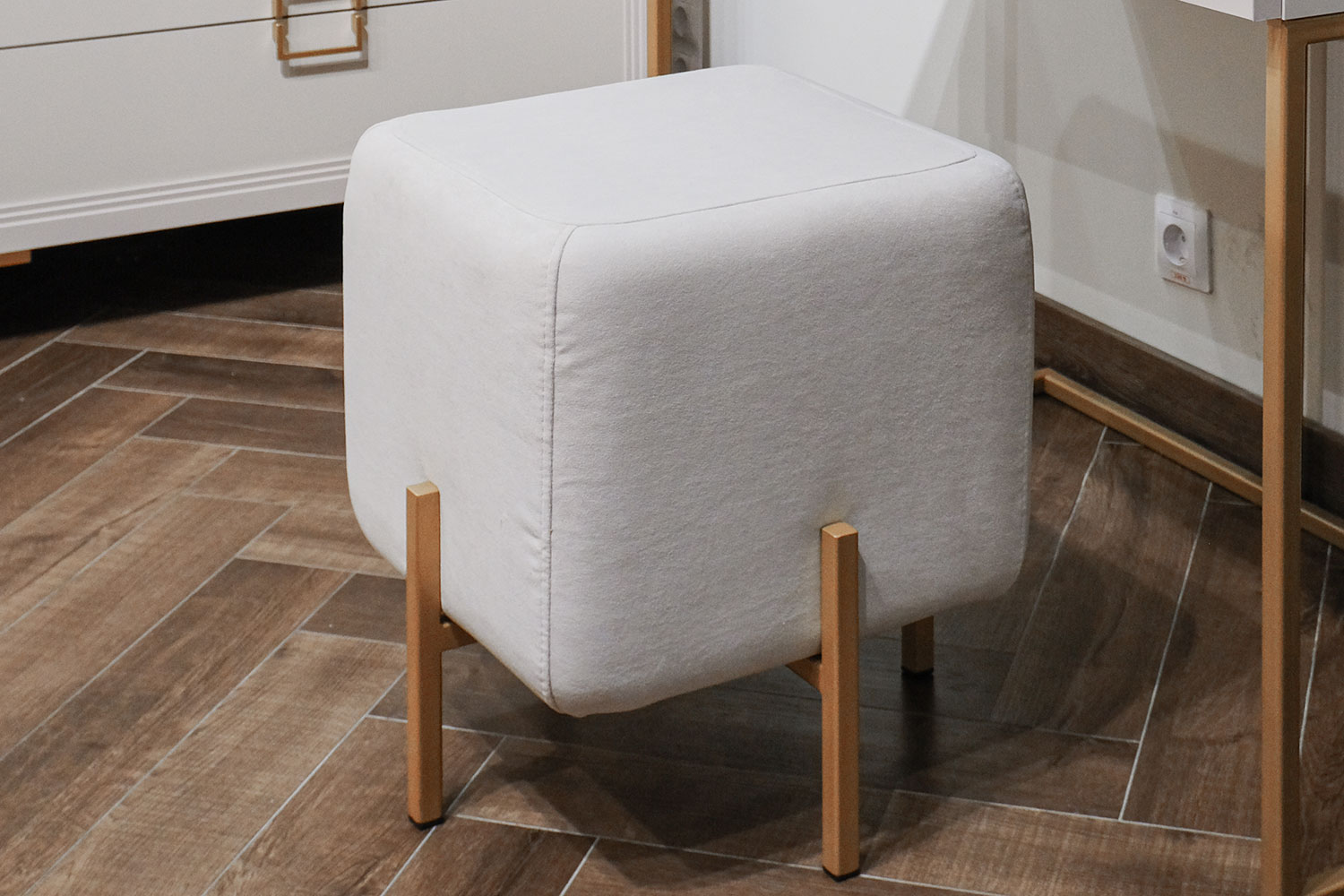 - Основу дизайна составляет геометрический символ — квадрат. Это видно по золотым матовым ручкам на тумбе и столе;