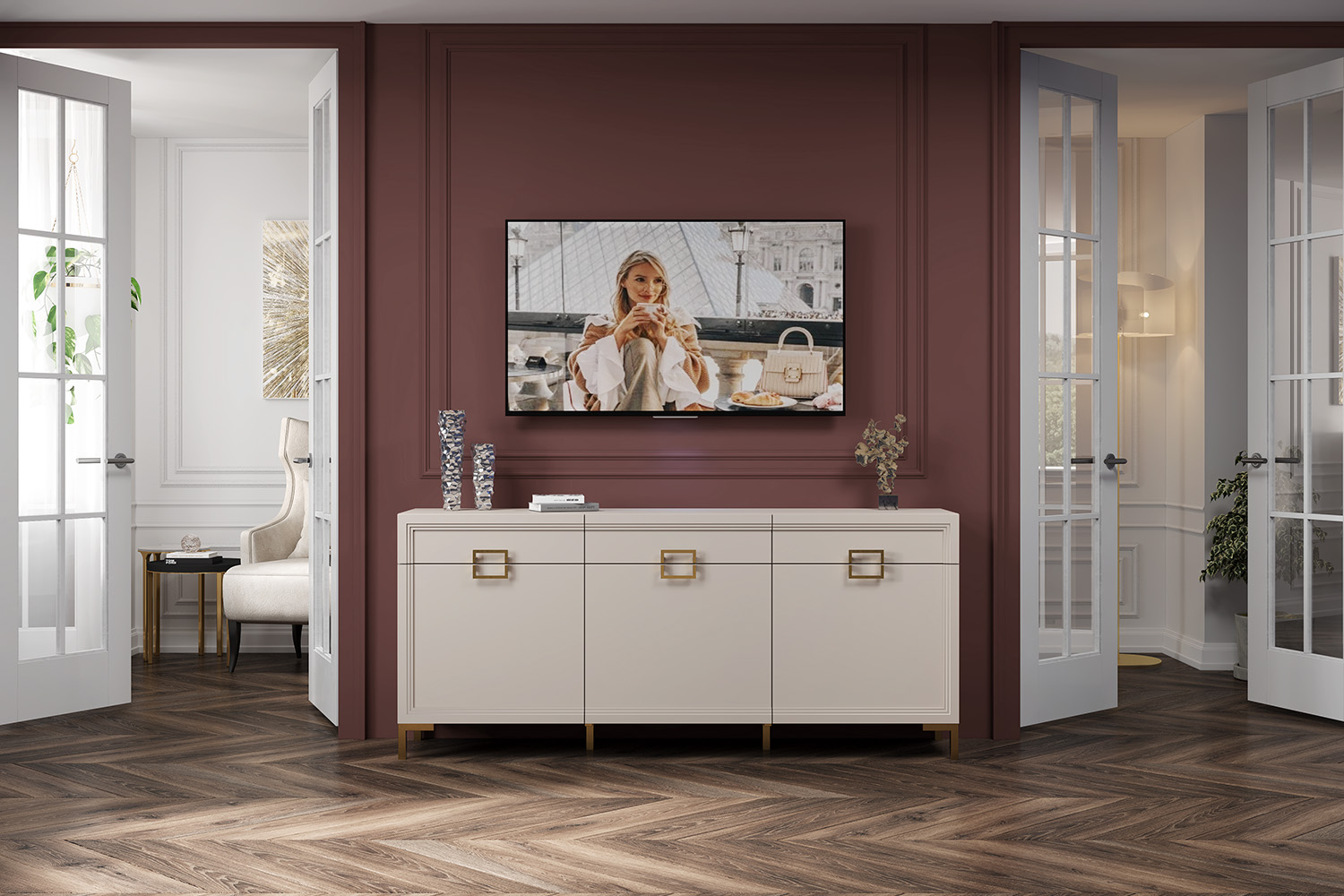 - Тумба с тремя выдвижными ящиками и тремя рамочными фасадами со вставкой ЛДСП 16 мм;