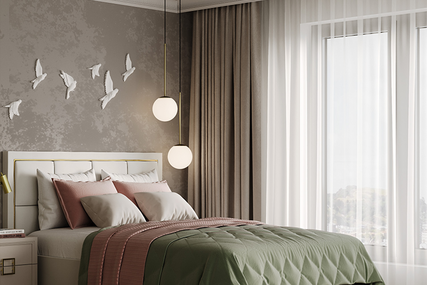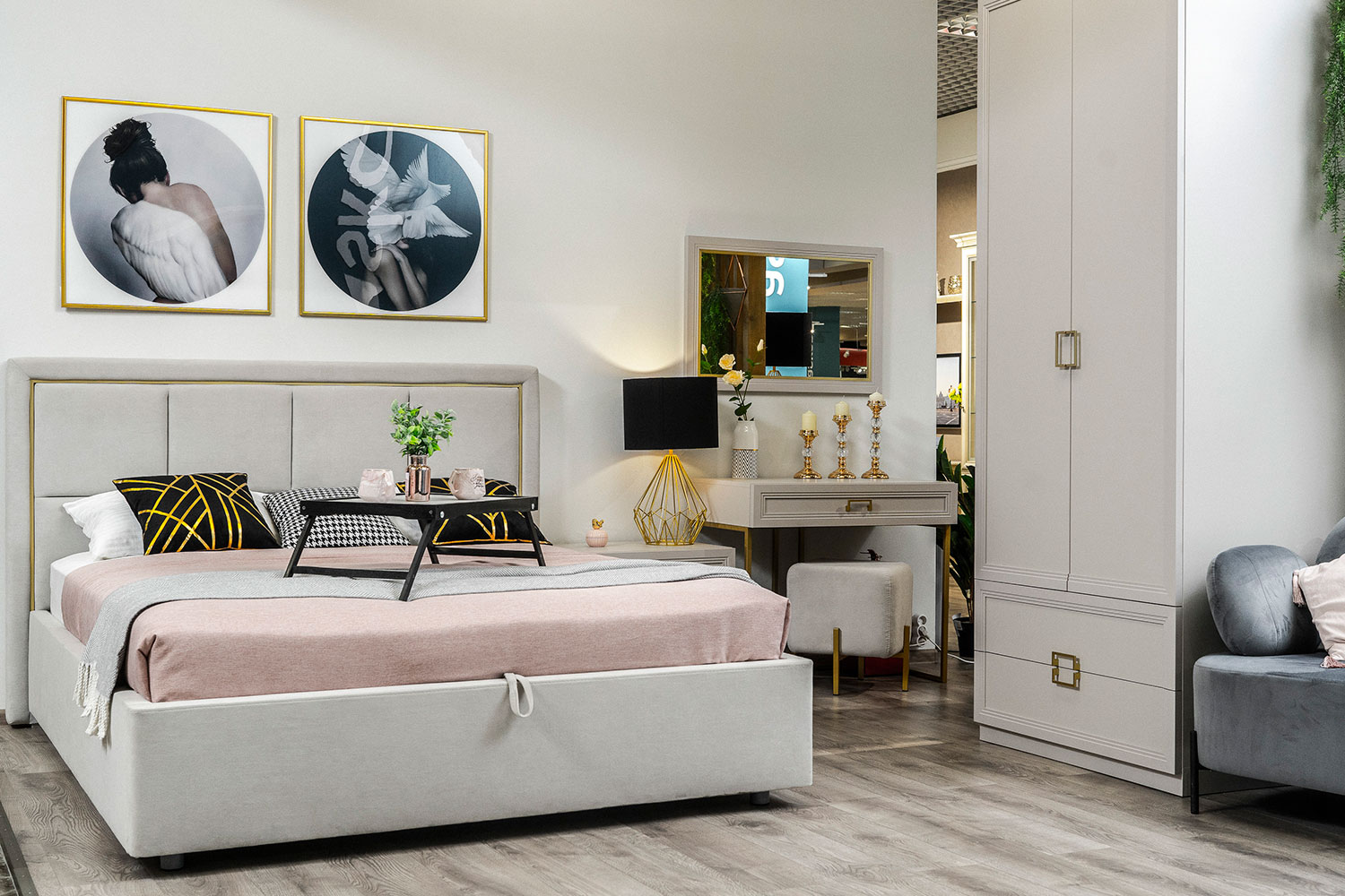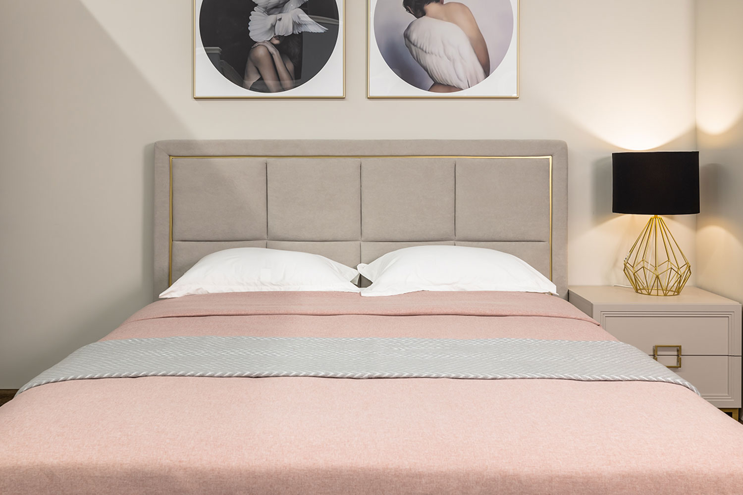 - Декоративная акцентная рама в изголовье кровати повторяет форму ручек.