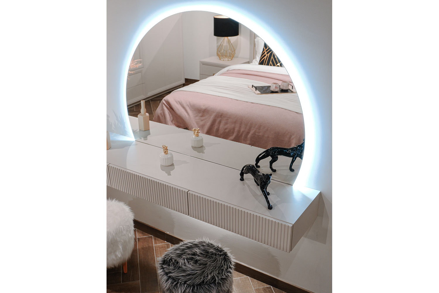 - Напольные тумбы выполнены с матовым тактильным эффектом из «серого кашемира»;