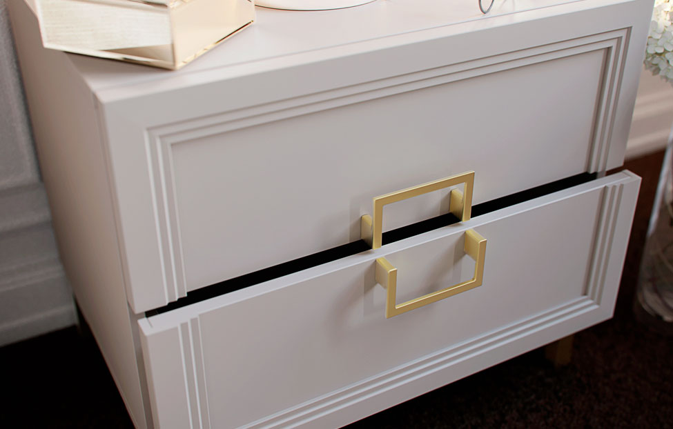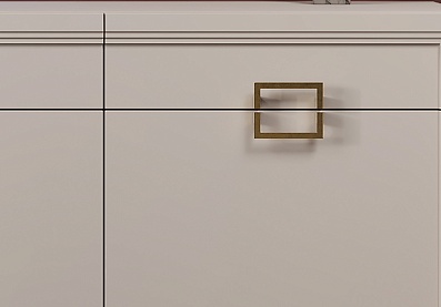 - Основу дизайна составляет геометрический символ — квадрат. Это видно по золотым матовым ручкам на тумбах;