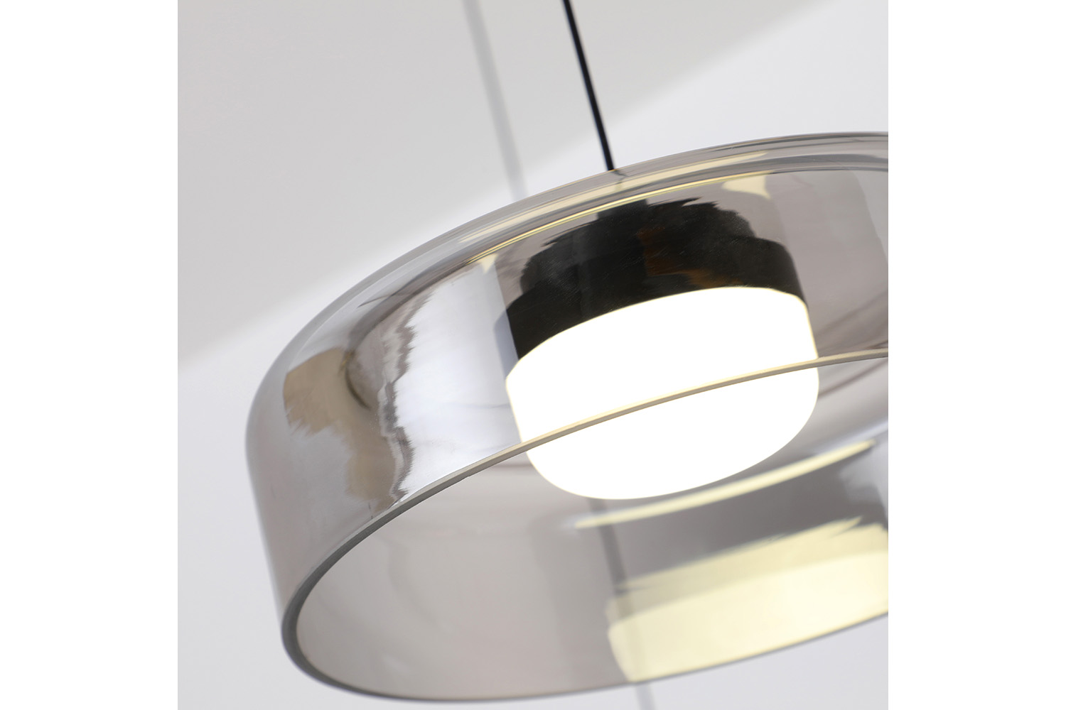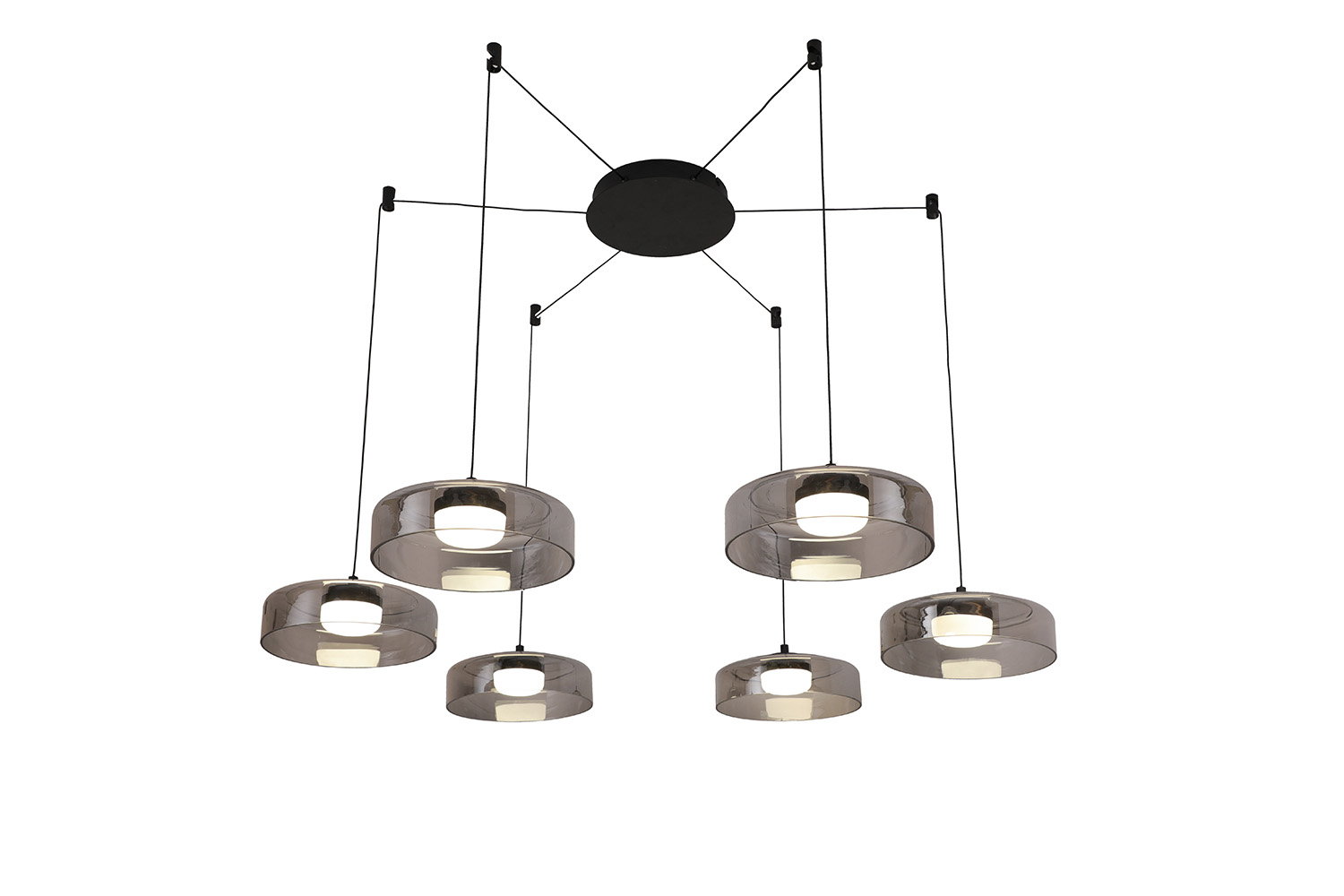 Коллекция Platta сочетает в себе черный каркас и дымчато-серые плафоны, которые крепятся к декоративным проводам, оснащенными стильными крепежами, благодаря которым можно крепить провода на потолке в любом порядке и на любой высоте в рамках длины провода.
