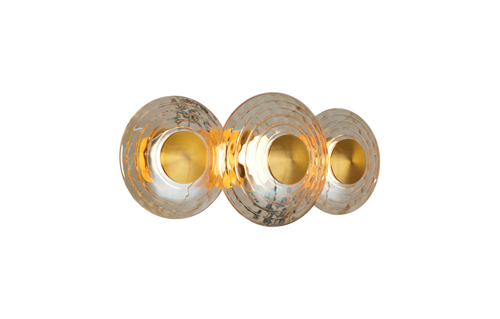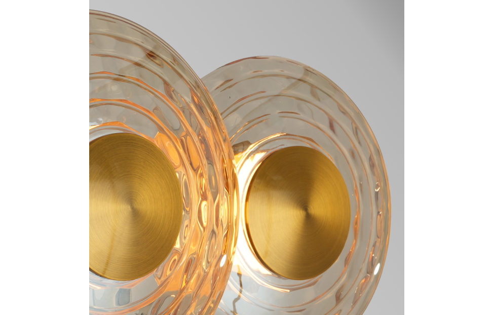 В основе дизайна светильников Claros лежат стеклянные закругленные фактурные плафоны, напоминающие изящные тарелки, между которыми встроены модули LED, создающие мягкое и комфортное освещение. Коллекция включает в себя одиночные подвесы, люстры, а также два вида настенных светильников, что позволяет создавать комплексное освещение пространства в едином стиле. Люстры можно легко комбинировать в оригинальные световые композиции, используя универсальные крепления, что дает простор для творческих решений и индивидуального подхода к оформлению интерьера. Металлический каркас цвета латунь, закругленный фактурный плафон из стекла янтарного цвета, LED-модуль.