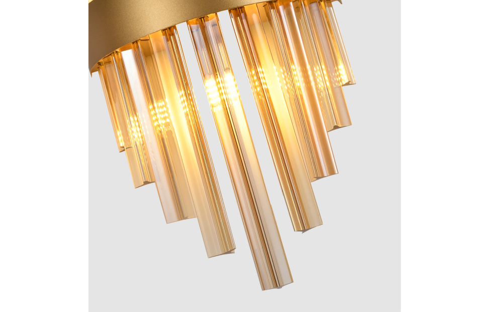 Металлический каркас в золотом цвете, дымчато-серый хрусталь, встроенная лента LED.