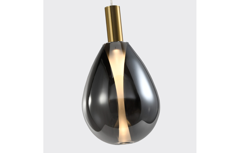 Особенностью подвесов Hopper является декоративный элемент в центре, формируемый в процессе выдувки стекла, который создает сложную и интересную форму плафона, становится основой его неповторимого облика. Плафон подсвечивается изнутри светодиодным источником света, создавая эмоциональное волнующее освещение. Подвес с каркасом в цвете латунь, с дымчато-серым плафоном, регулируемая высота.