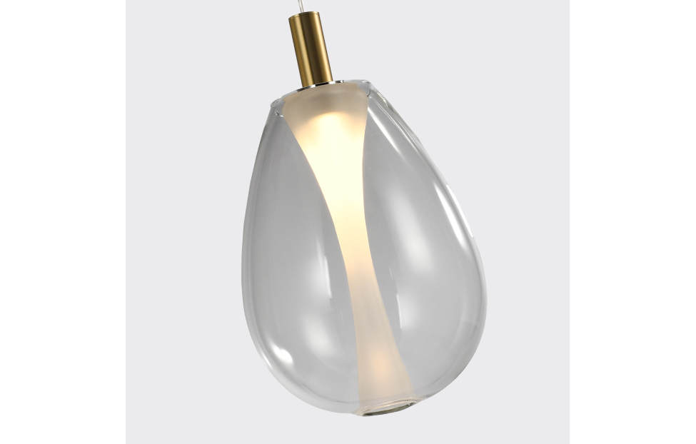 Особенностью подвесов Hopper является декоративный элемент в центре, формируемый в процессе выдувки стекла, который создает сложную и интересную форму плафона, становится основой его неповторимого облика. Плафон подсвечивается изнутри светодиодным источником света, создавая эмоциональное волнующее освещение. Подвес с каркасом в цвете латунь, с плафоном в прозрачном цвете, регулируемая высота