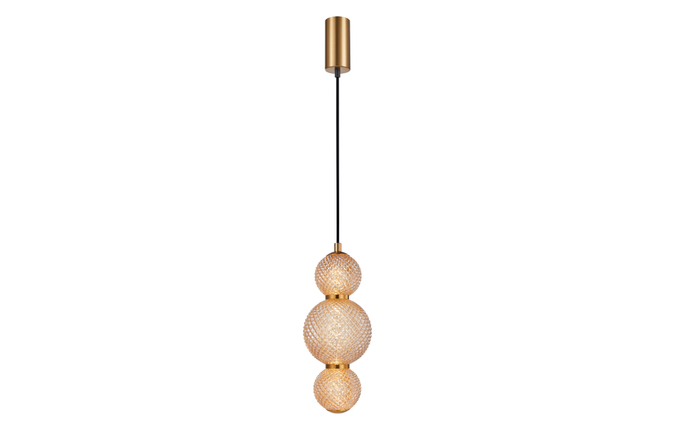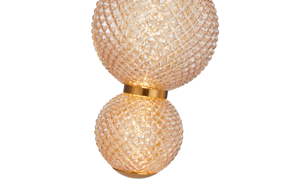 Коллекция Kiran – это гармония стекла и света. Стеклянные фактурные плафоны раскрывают свой характер в мягком струящемся свете и узорных отражениях на потолке, стенах, предметах мебели. В качестве источника света используется трубка с LED-модулем, проходящая внутри плафонов из янтарного фактурного стекла. Декоративный ободок золотого цвета добавляет сдержанного блеска в дизайн коллекции и придает ей особую привлекательность. Регулируемая высота.