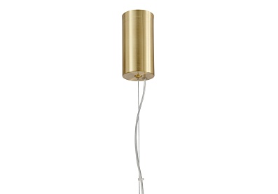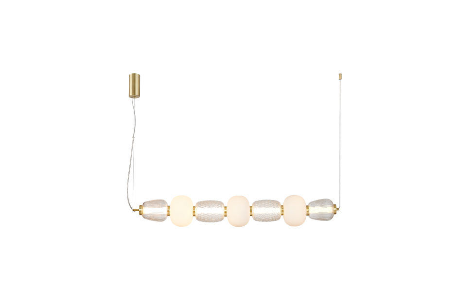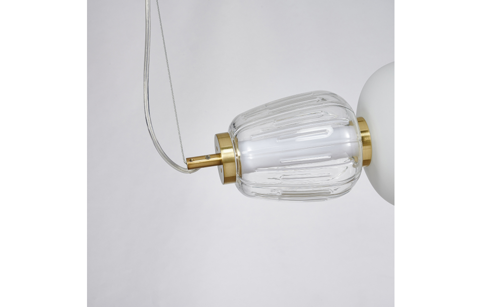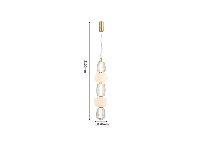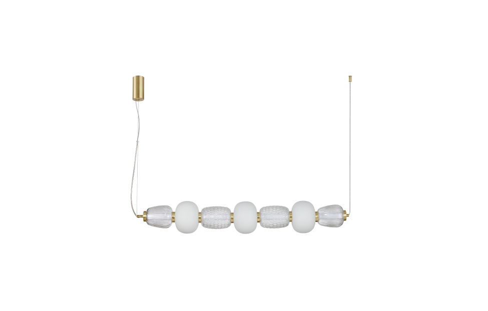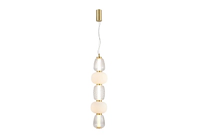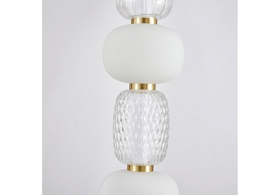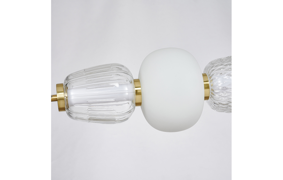 Чередование стеклянных плафонов разной формы, цвета и рисунка, а также цветовое решение каркаса в золоте создает насыщенный сложный и дорогой образ. Металлический каркас цвета золота, плафоны в виде бусин разнообразных форм из выдувного стекла двух видов - прозрачного и цвета опала, часть каркаса фиксируется тросиком для баланса.