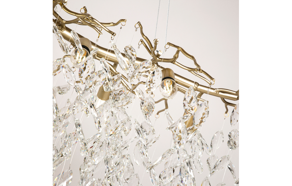 Коллекция Brillo выполнена в стиле современной флористики. Светильники декорированы хрустальными подвесками в виде листьев дерева. Каркас выполнен в цвете матового золота. Эти светильники созданы, чтобы стать ярким акцентом интерьера.