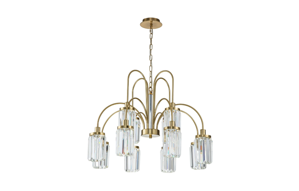 Duke – коллекция в современном стиле. Рожки изысканной формы, напоминающей струи фонтана, покрыты золотой гальваникой и декорированы хрустальными подвесками прямоугольной формы, которые красиво преломляют свет ламп. Центральный шток украшен стеклянным цилиндром.