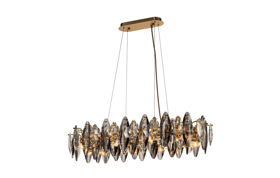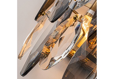 Glans – элегантная кольцевая коллекция, в которой используется прозрачный и серебристо-дымчатый хрусталь в ритмичном чередовании. Металлическая арматура светильника скрыта за хрустальными лепестками, создавая ощущение легкости и невесомости. К этой серии подходят универсальные крепления с помощью которых можно создать кольцевые композиции из нескольких люстр. Подвесная кольцевая люстра длиной 80 см, каркас в бронзовом цвете, лепестки прозрачного и дымчато-серого хрусталя разного размера, регулируемая высота.