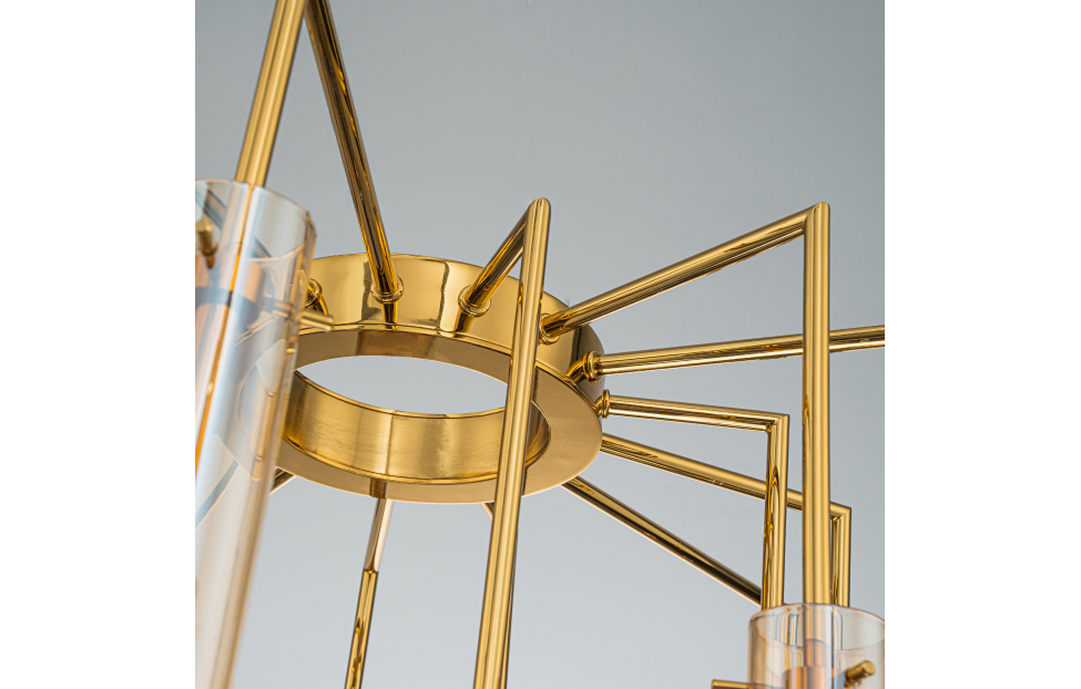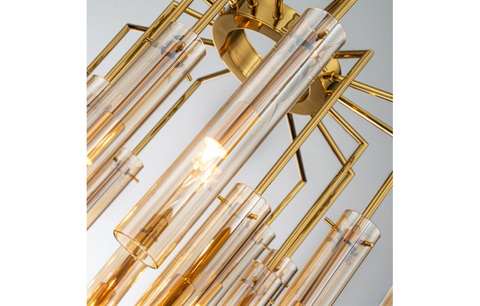Каскадная люстра Orgel, каркас в цвете золото, состоит из металлических трубок, изогнутых от центрального кольца под прямым углом, на конце каждой трубки расположен тонкий длинный плафон из стекла янтарного цвета. сменная лампа G9, регулируемая высота.