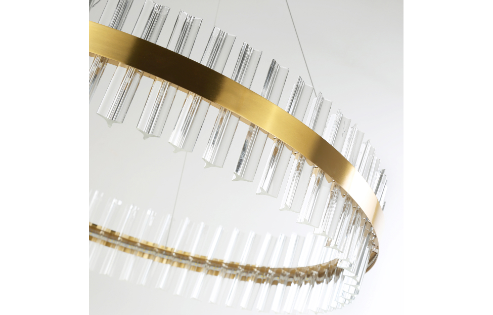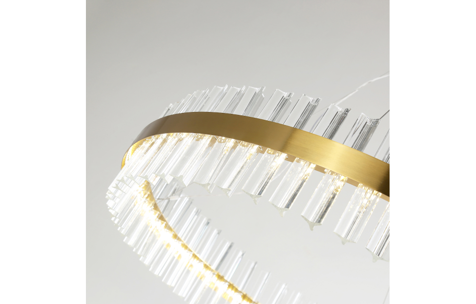 Коллекция Placerat выполнена в стиле модерн с использованием технологий LED. Модели облегчены за счет световых колец, которые крепятся к внутренней части каркаса. Вытянутые переливающиеся кристаллы встроены в соответствующие треугольные отверстия в каркасе. Светильники адаптируются по высоте.