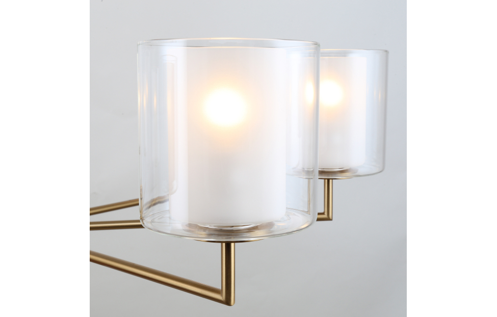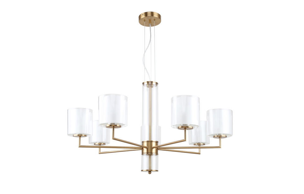 Оригинальные плафоны из двойного стекла – изюминка коллекции светильников Proper. Внутренние плафоны выполнены из матового белого стекла, внешние – из прозрачного стекла. Вторым оригинальным элементом коллекции является центральный шток с декоративным стеклянным цилиндром. Крепление на тросах позволяет регулировать высоту.
