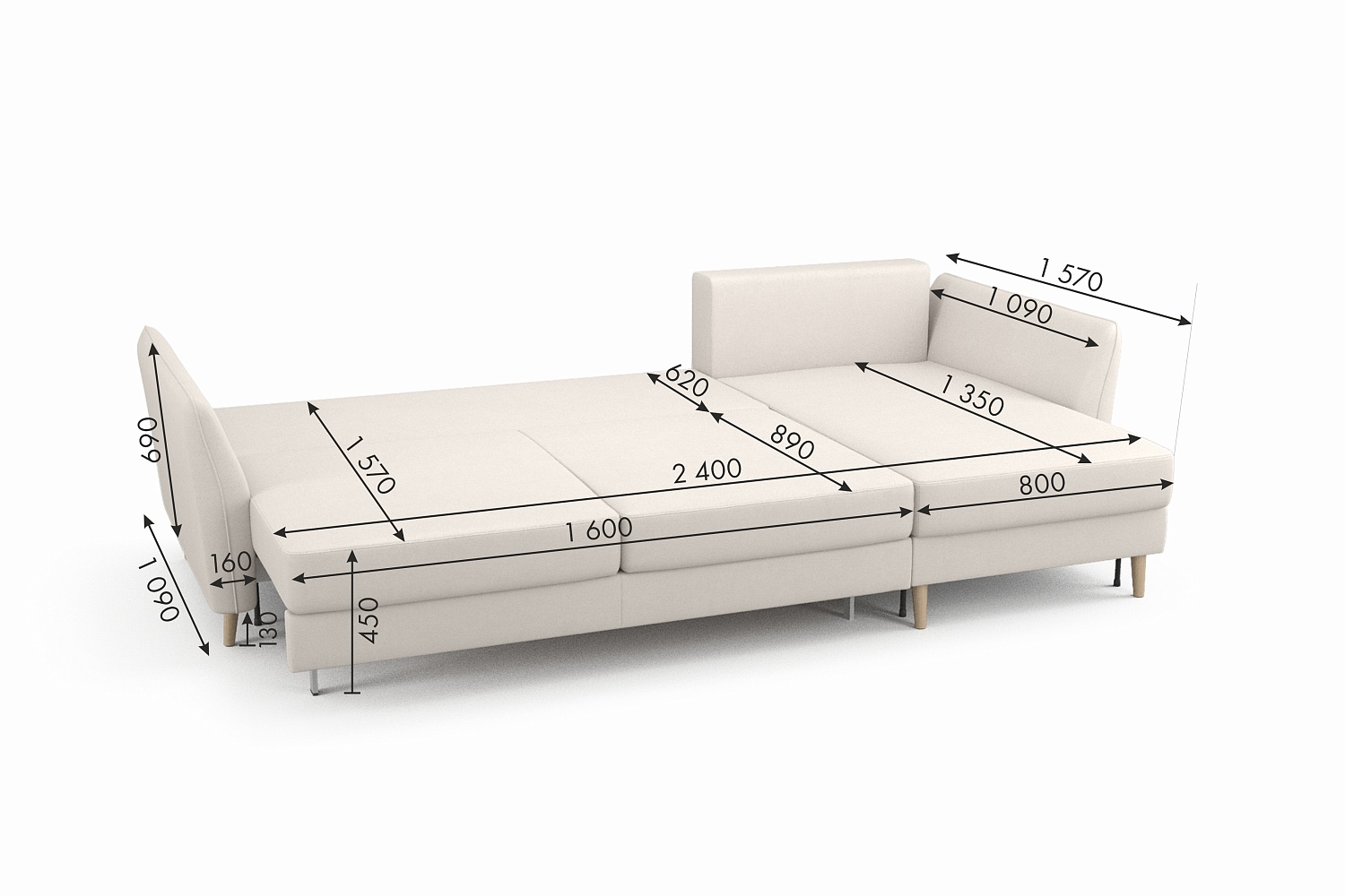 - Высота дивана с ножками: 75 см;