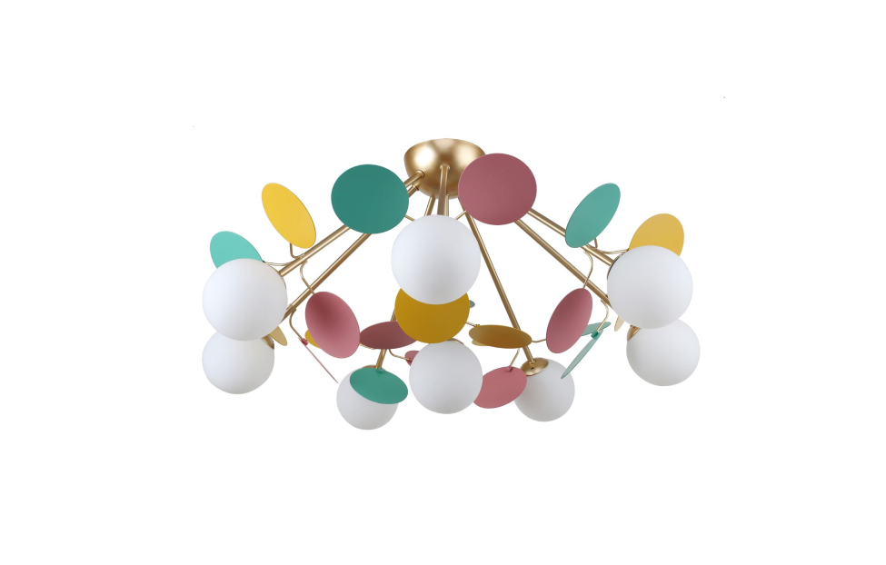 Multi Bliss поражает своим буйством красок и контрастом. Светильники из коллекции Multy Bliss чаще всего используют для детских комнат, чтобы создать уютную и игривую атмосферу. Декоративные круглые разноцветные пластины люстры и бра создают яркий и эффектный акцент в интерьере, придавая ему оригинальность и индивидуальность. Металлический каркас золотого цвета, круглые стеклянные плафоны молочного цвета, декоративные круглые разноцветные пластины, декоративные золотые шары, регулируемая высота.