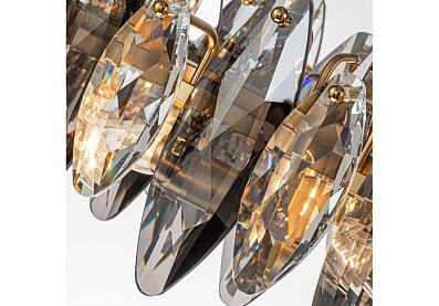 Мебель выполнена из экологичной древесной плиты. Рамочные фасады украшены стильными латунными ручками, отделанными под античную бронзу. Меблировка отличается вместительностью: два высоких шкафа с застекленным верхом, ТВ-тумба и настенные полки позволяют хранить под рукой все необходимые вещи. Бесшумную эксплуатацию обеспечивает система скрытых направляющих со встроенным демпфером и петли с доводчиками. Качественная фурнитура гарантирует надежность крепления.