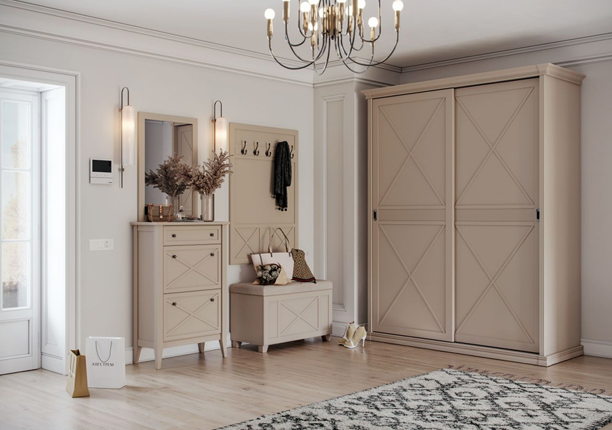- Мебель Кантри украсит легкий классический интерьер прихожей;