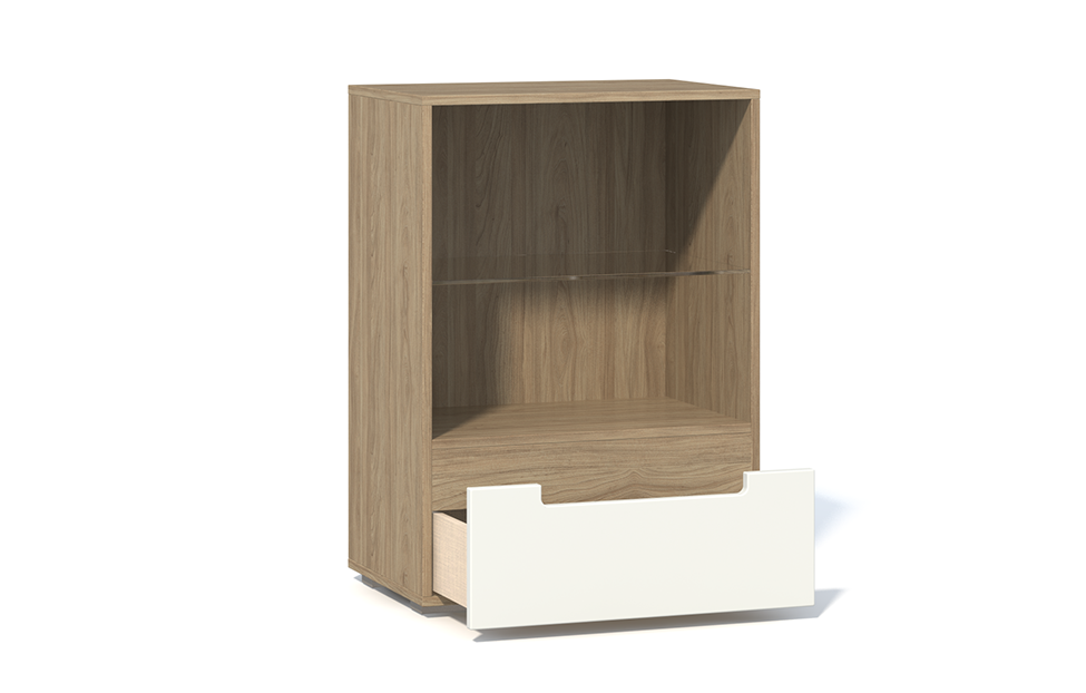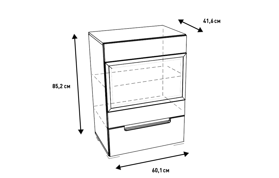 - Комплектуются одной стеклянной полкой (в отделении за дверью со стеклянной вставкой) и выдвижным ящиком в нижнем отделении;