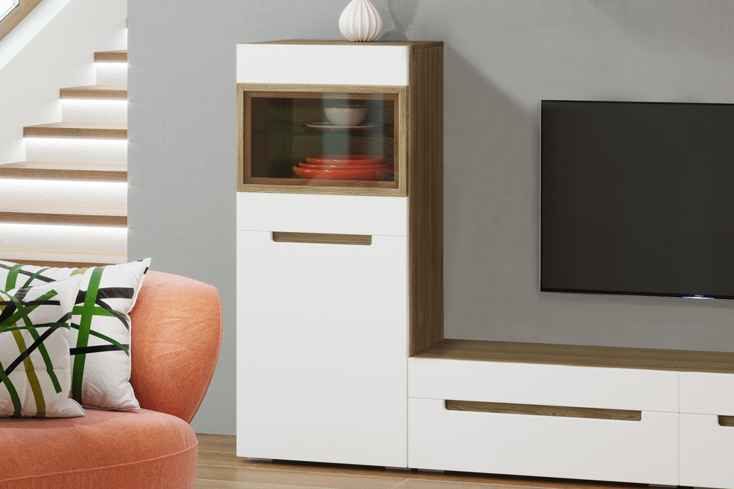 – описание: стиль современный, минимализм, назначение для гостиной, цвет швейцарский вяз, белый, размер 136.4x60.1x41.6 см.