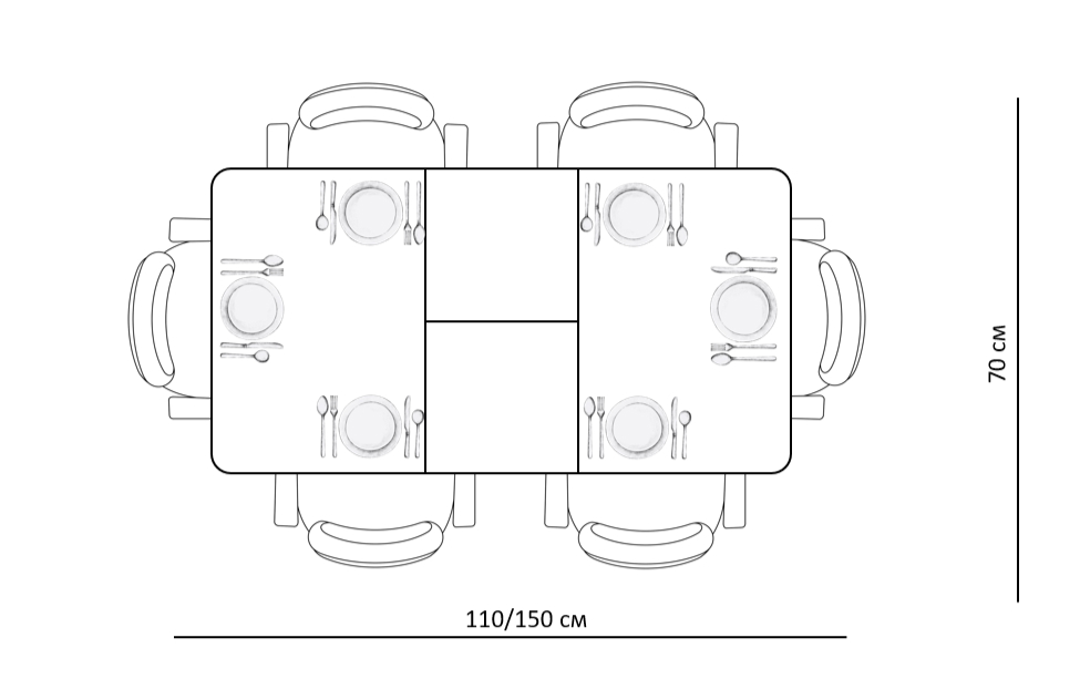 Размер стола компактный и в то же время достаточно вместительный для ежедневного использования 4 человек, по каждой стороне достаточно места чтобы поставить 4 широких стула вокруг стола. Механизм раздвижения со стеклянной вставкой позволяет комфортно посадить еще 2 гостей. Компактный и очень функциональный стол, идеален для использования как на небольшой кухне, так и в качестве уютной обеденной зоны в гостиной.