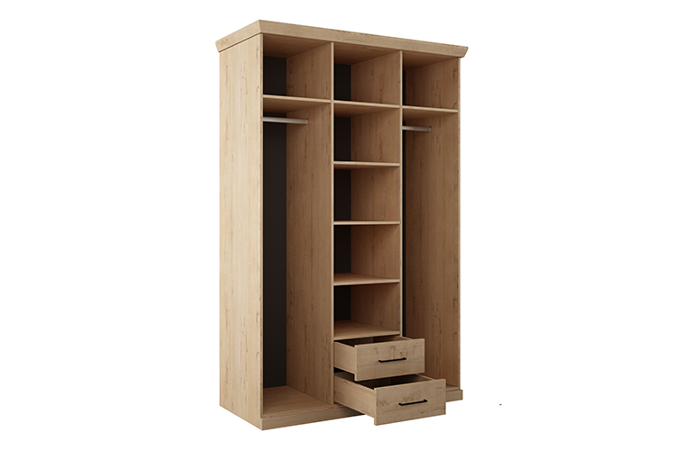 Модель оформлена в модном индустриальном стиле. Фасады имеют рамочную конструкцию, средний оснащен вертикальной зеркальной вставкой, облегчающей процесс сборов. Светлая древесная текстура корпуса стильно контрастирует с темным цветом внутренних стенок и фурнитурой в оттенке «черное античное железо». Направляющие и петли снабжены демпферами и доводчиками, обеспечивающими бесшумную эксплуатацию мебели.