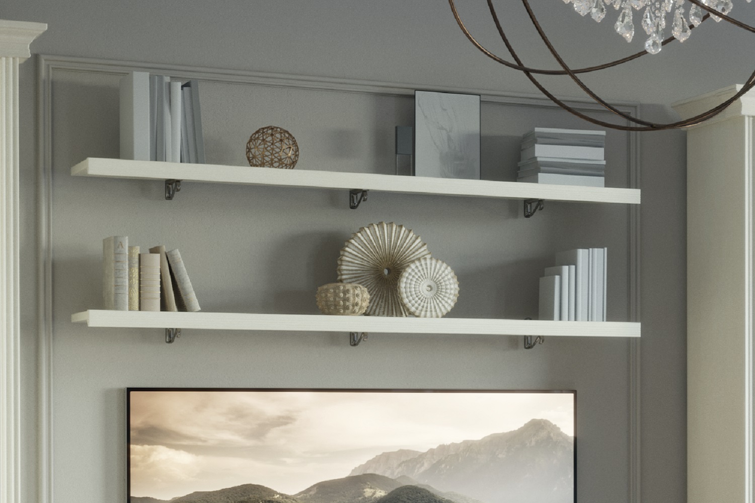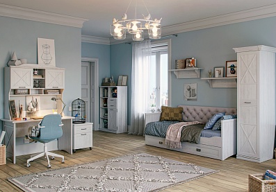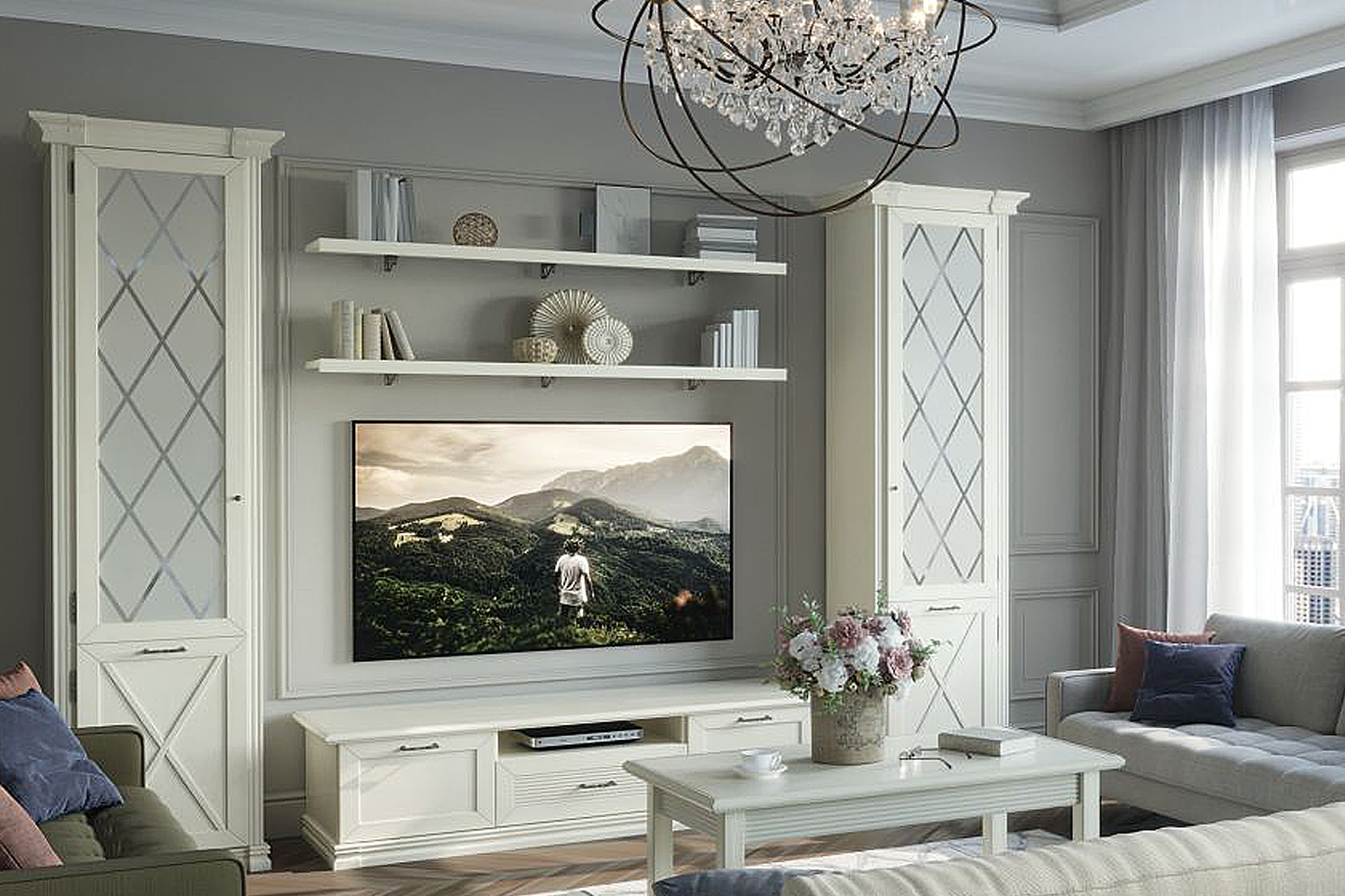 Мебель выполнена из экологичной древесной плиты. Рамочные фасады украшены стильными латунными ручками, отделанными под античную бронзу. Меблировка отличается вместительностью: два высоких шкафа с застекленным верхом, ТВ-тумба и настенные полки позволяют хранить под рукой все необходимые вещи. Бесшумную эксплуатацию обеспечивает система скрытых направляющих со встроенным демпфером и петли с доводчиками. Качественная фурнитура гарантирует надежность крепления.
